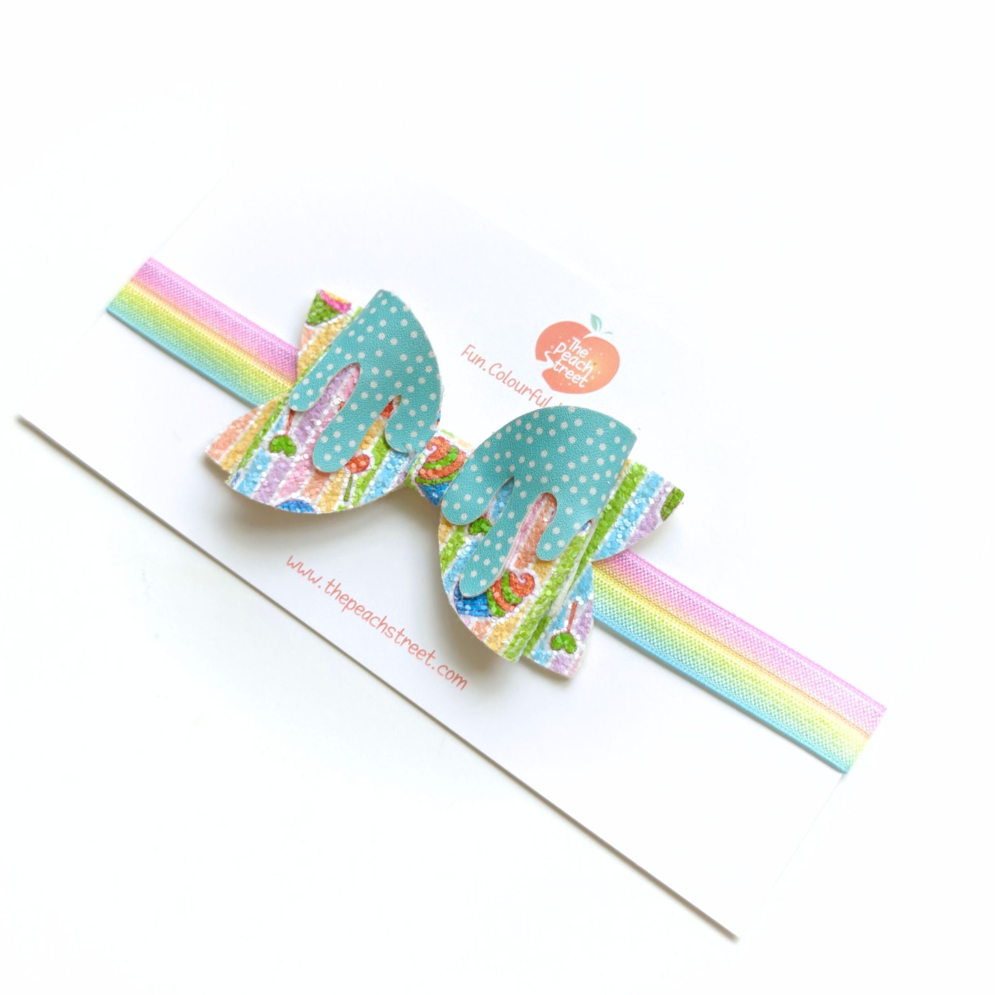 Sweet, colorful, and a little magical β this βtreatβ headband is bursting with candy vibes! A pastel rainbow bow sprinkled with swirls of lollipops is topped with a playful blue polka-dot dripping glaze effect. Finished on a rainbow elastic band, itβs comfy, lightweight, and oh-so-fun for Halloween or year-round dress-up.
