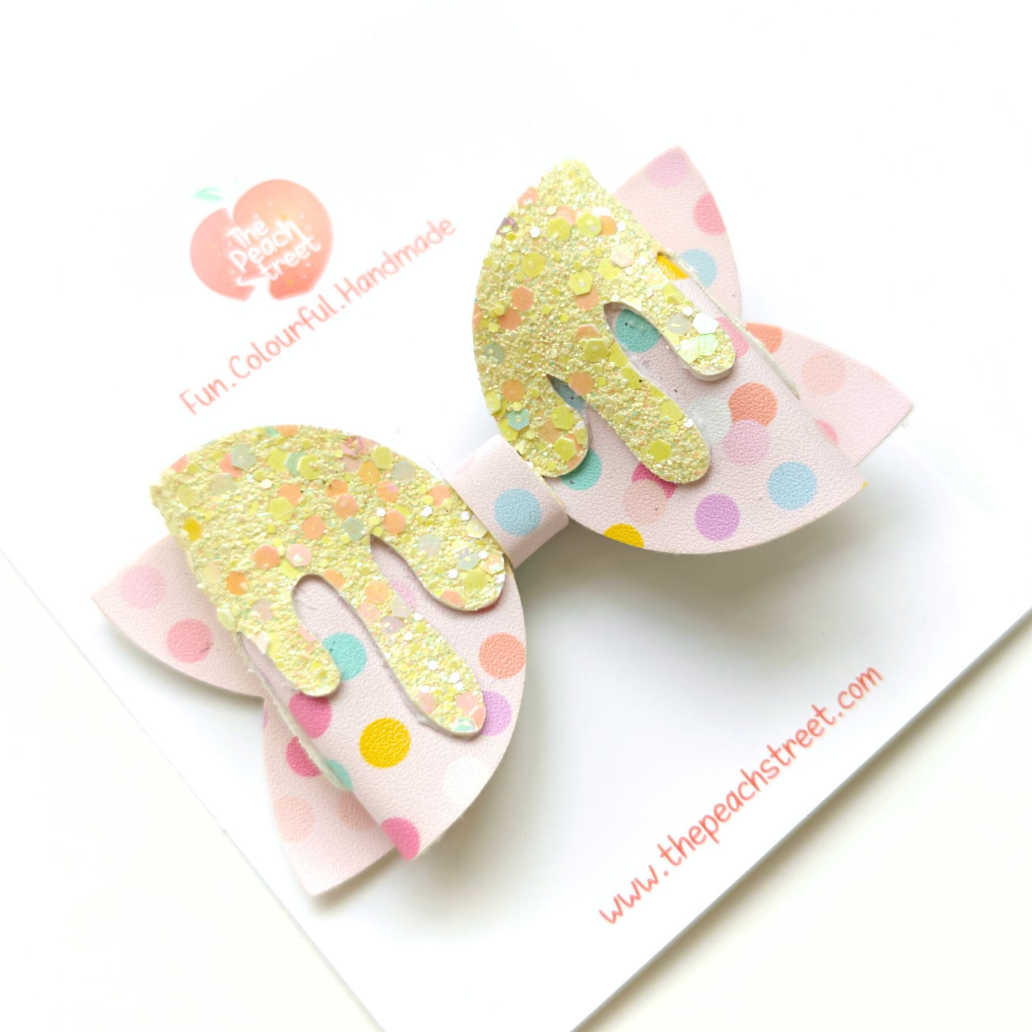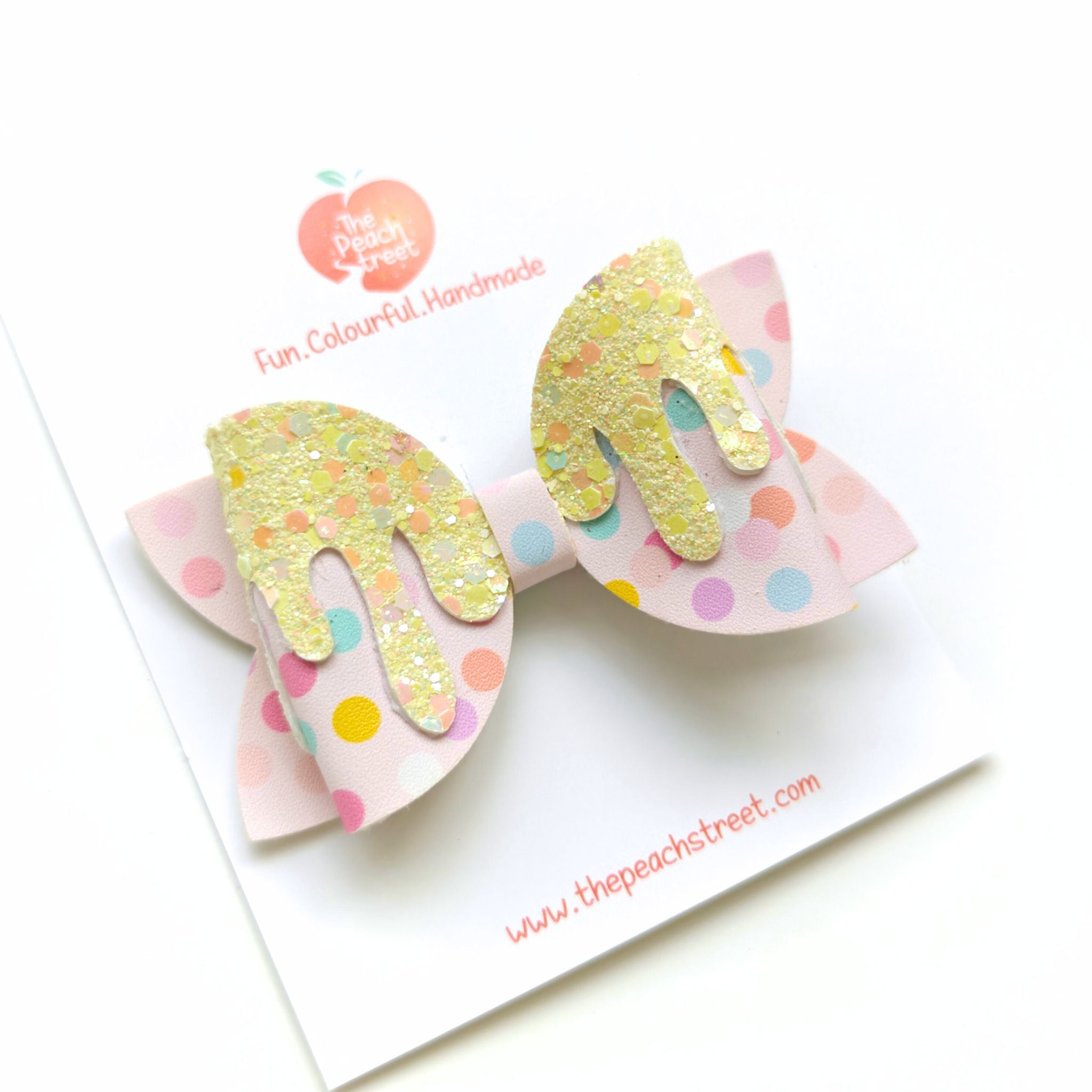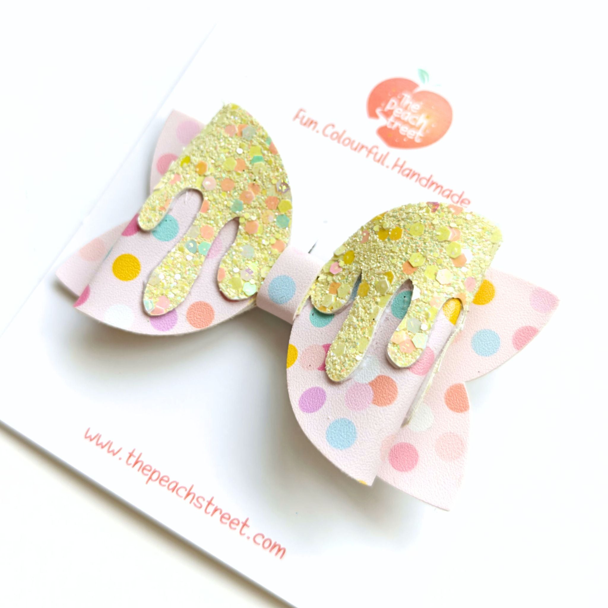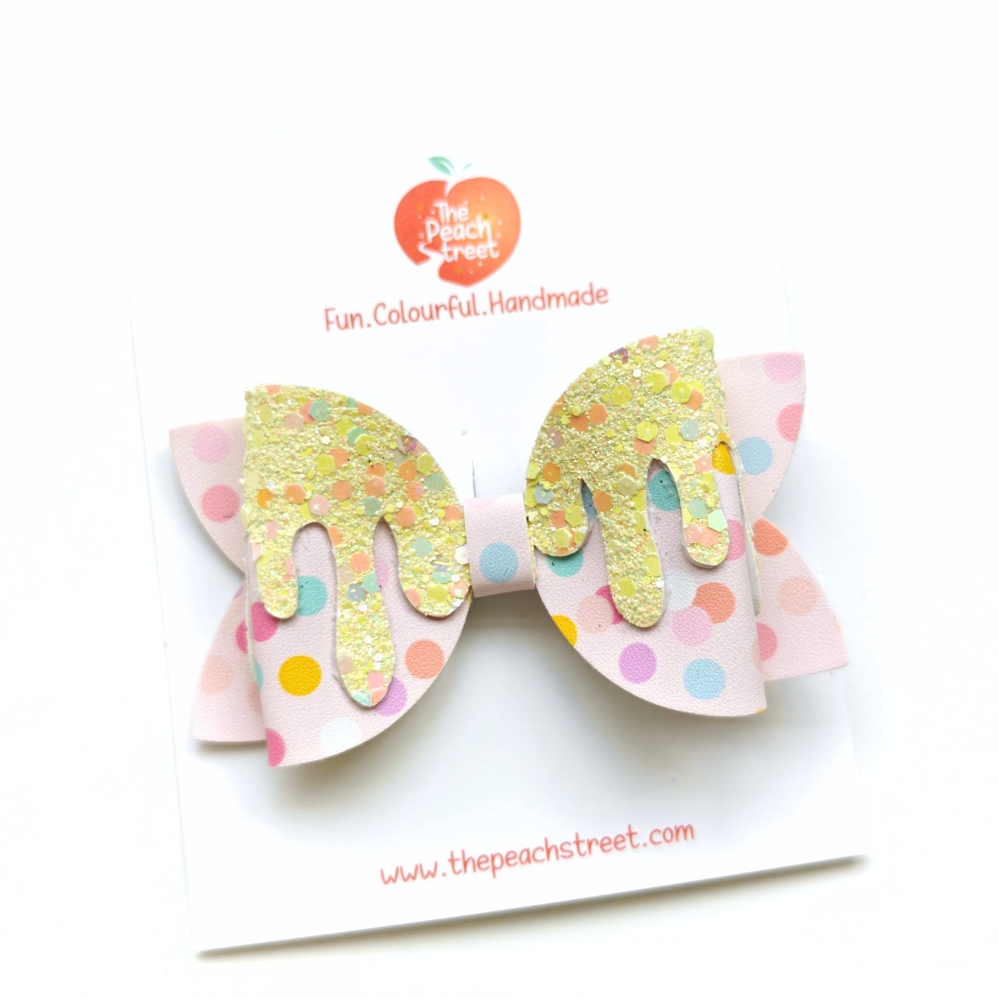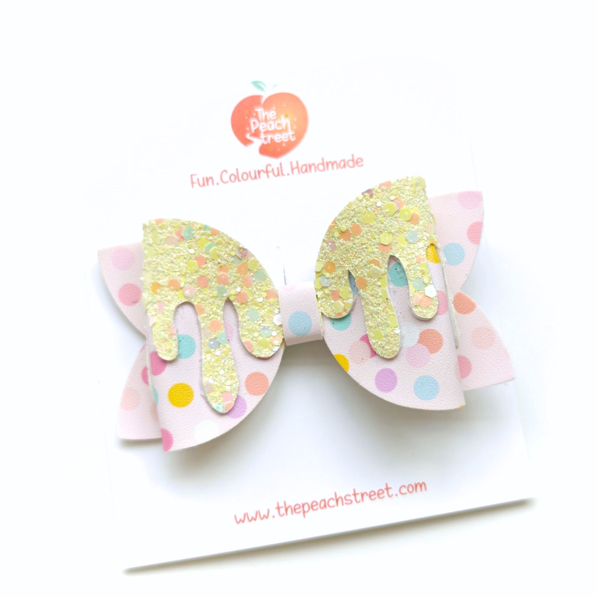 A swirl of sweetness with a dash of sparkle β this pastel polka-dot bow is topped with glittering golden drips that look like melted candy magic! Bright, playful, and full of festive charm, itβs the perfect accessory for Halloween parties, trick-or-treating, or just adding a sugary-sweet touch to everyday outfits.