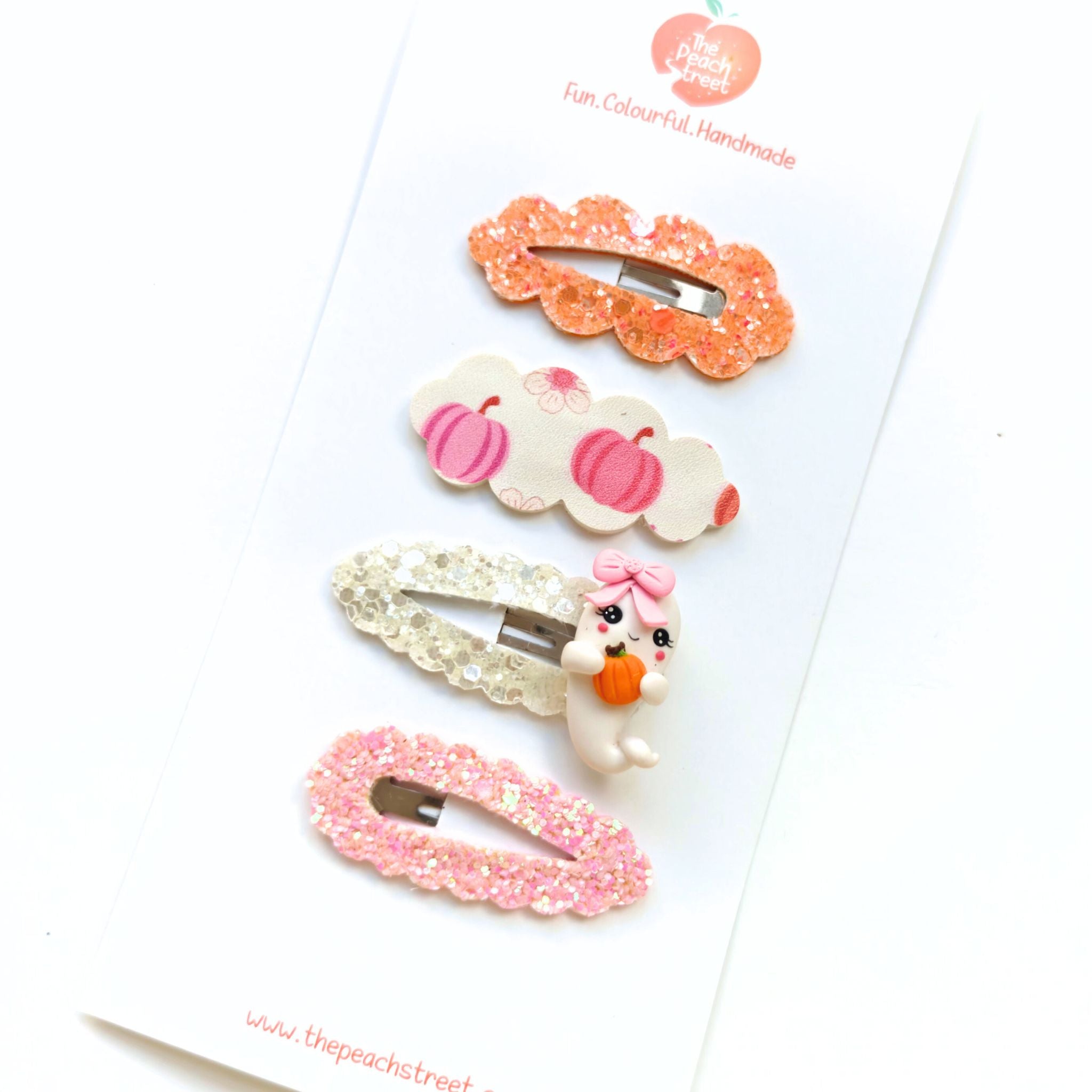 Sweet, spooky, and oh-so-pretty! This 4-piece Halloween clip set is all about pastel pumpkin magic: