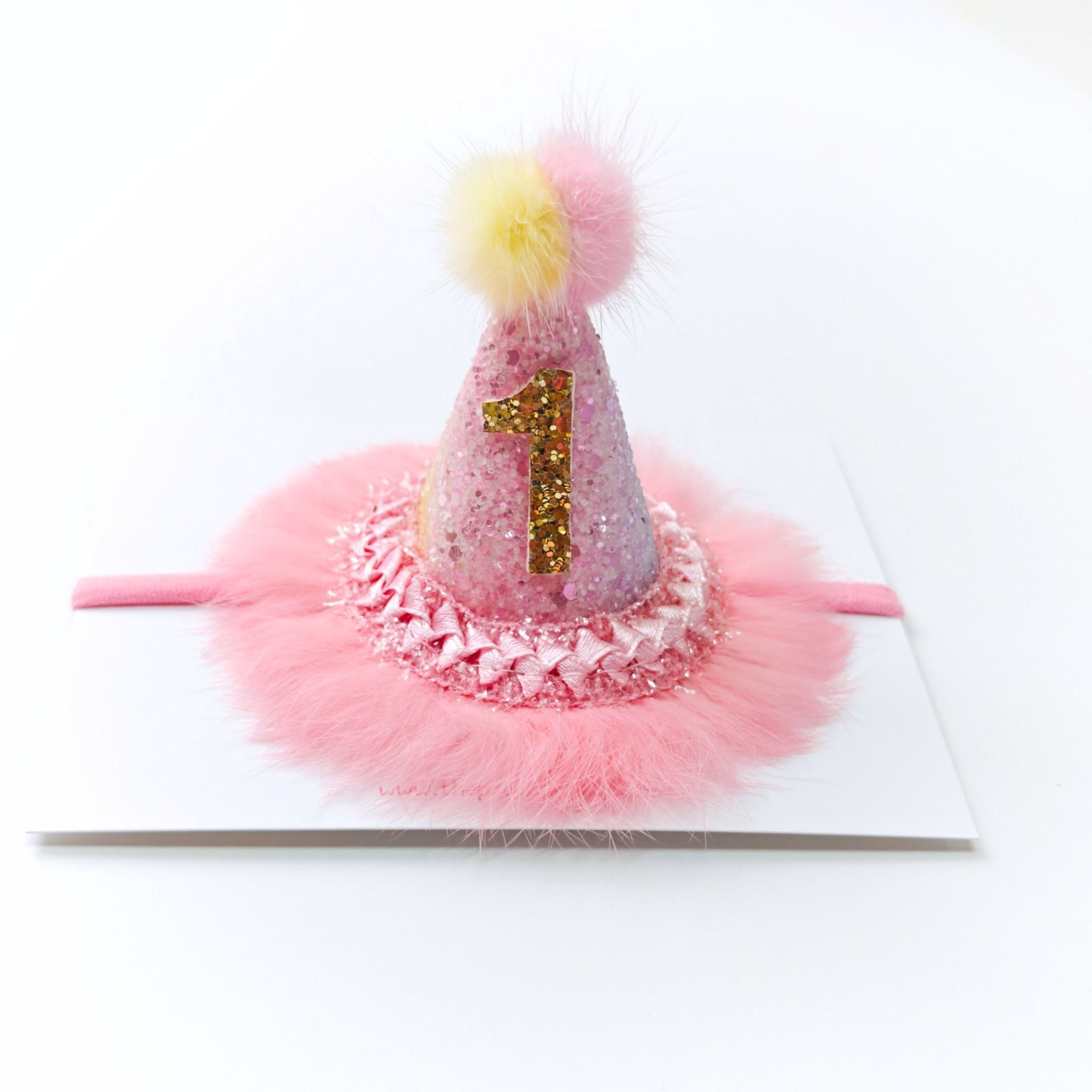 Glittery pastel multicoloured party hat with matching fur trim & pom-pom on a nylon headband