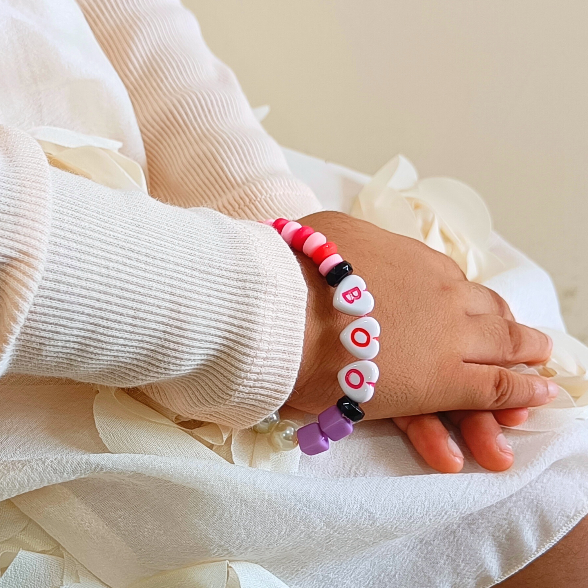 Colourful bracelet in the colours of Halloween, pearls & beads strung together on a stretchy elastic with beads which spell BOO.. Spookyyyy