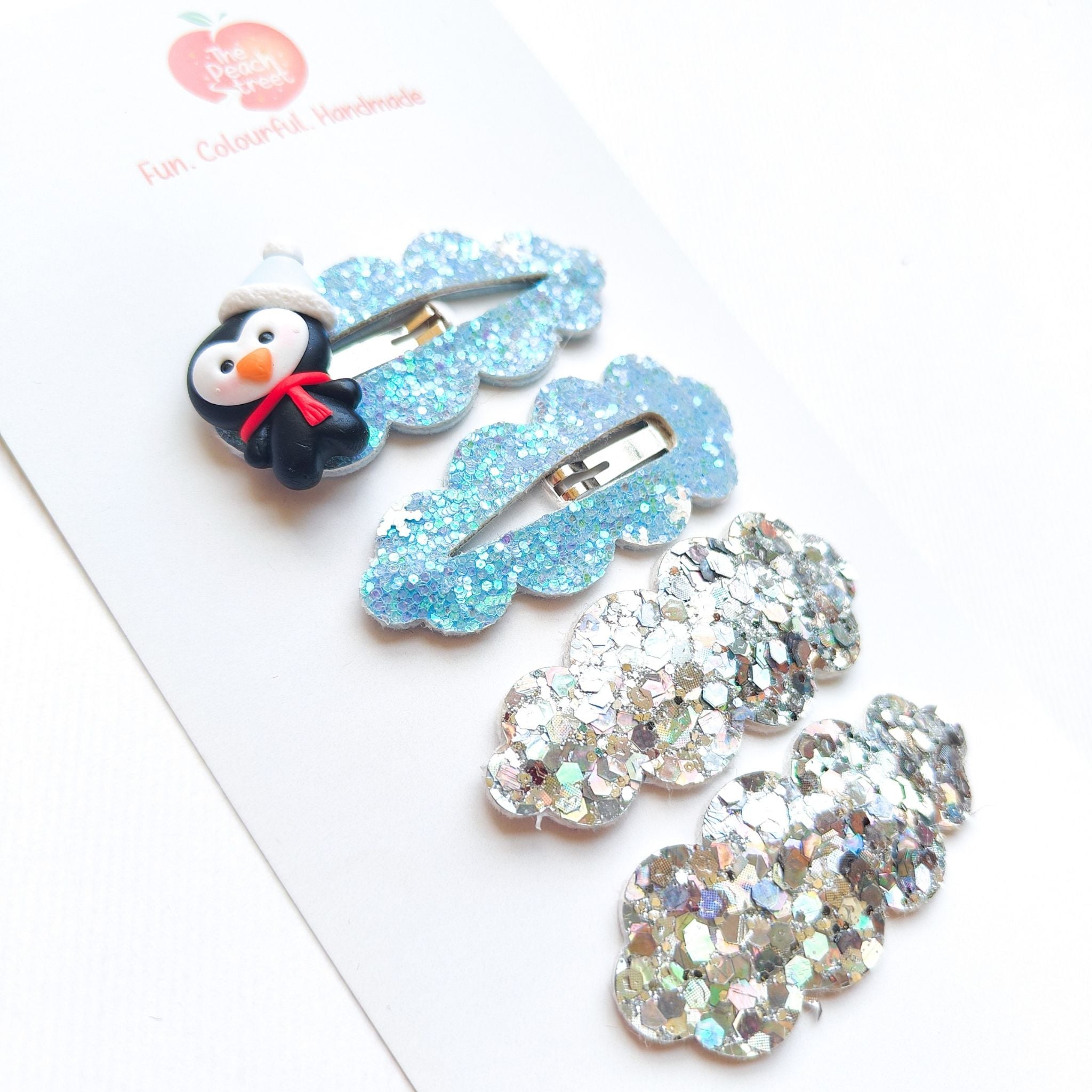 Add a touch of winter magic to her hairstyle with our Frosty Sparkle Snap Clip Set. This delightful set includes four snap clips—two shimmering in icy blue glitter, and two in dazzling silver glitter. The set features a charming penguin detail, perfect for bringing a playful, frosty vibe to any outfit. Designed to secure her hair with style, these clips are both fun and functional, making them an ideal accessory for the festive season or any winter-inspired look. Let her shine and sparkle with this enchanting clip set!
