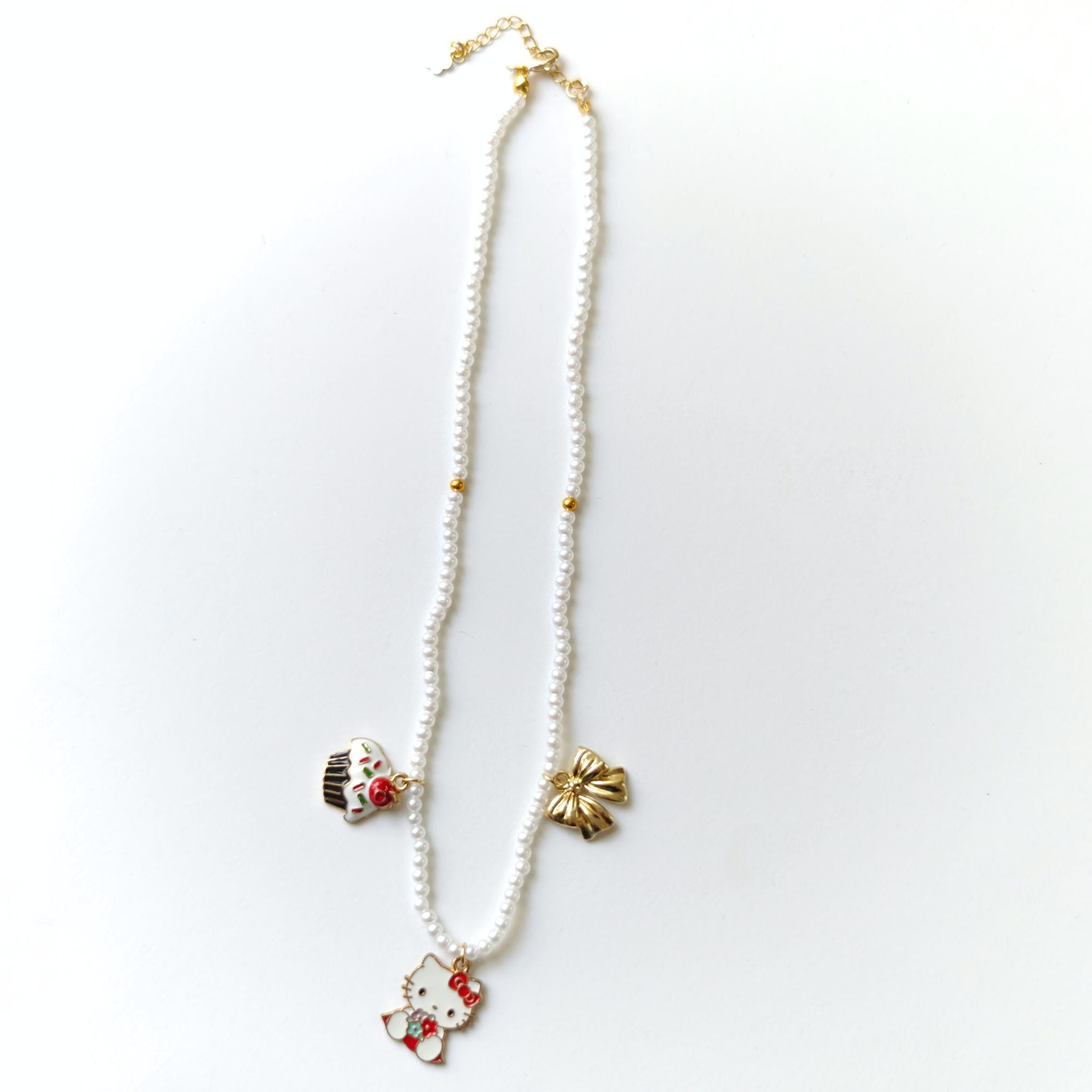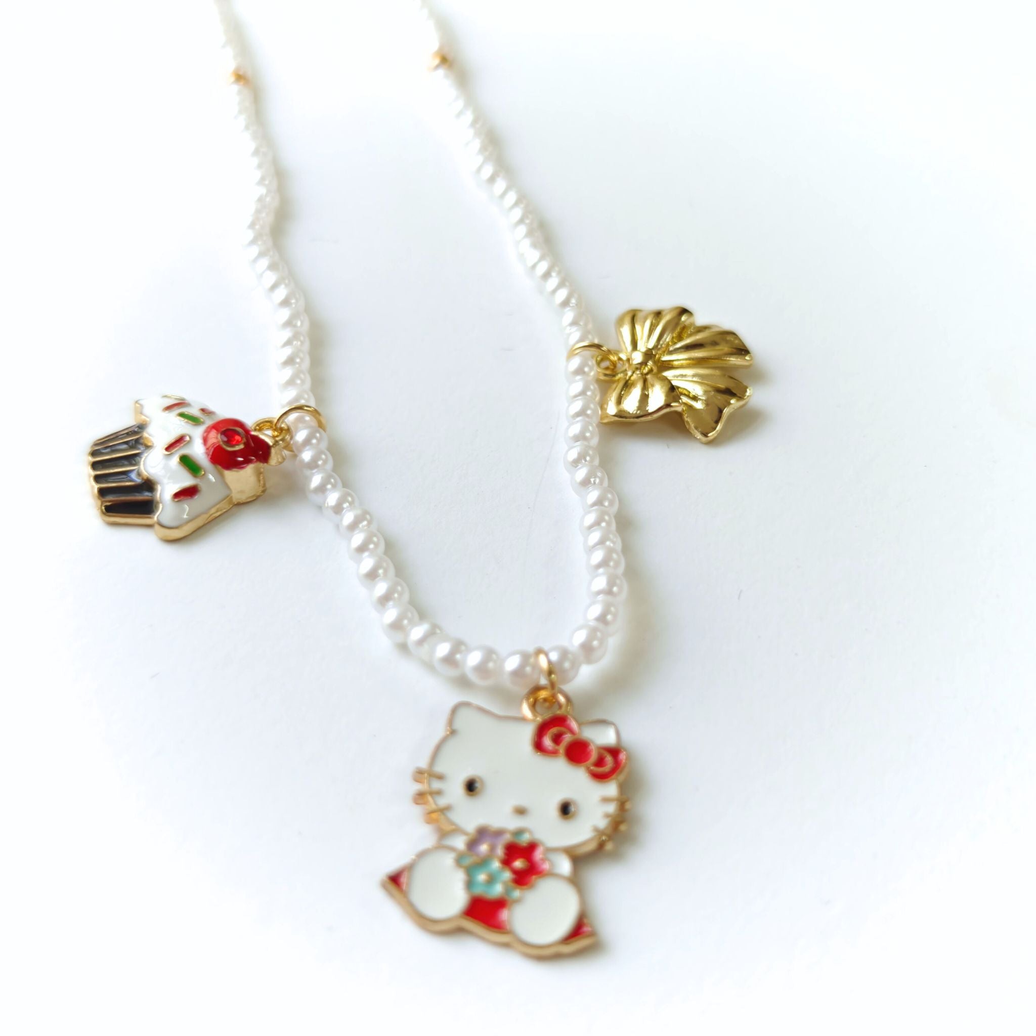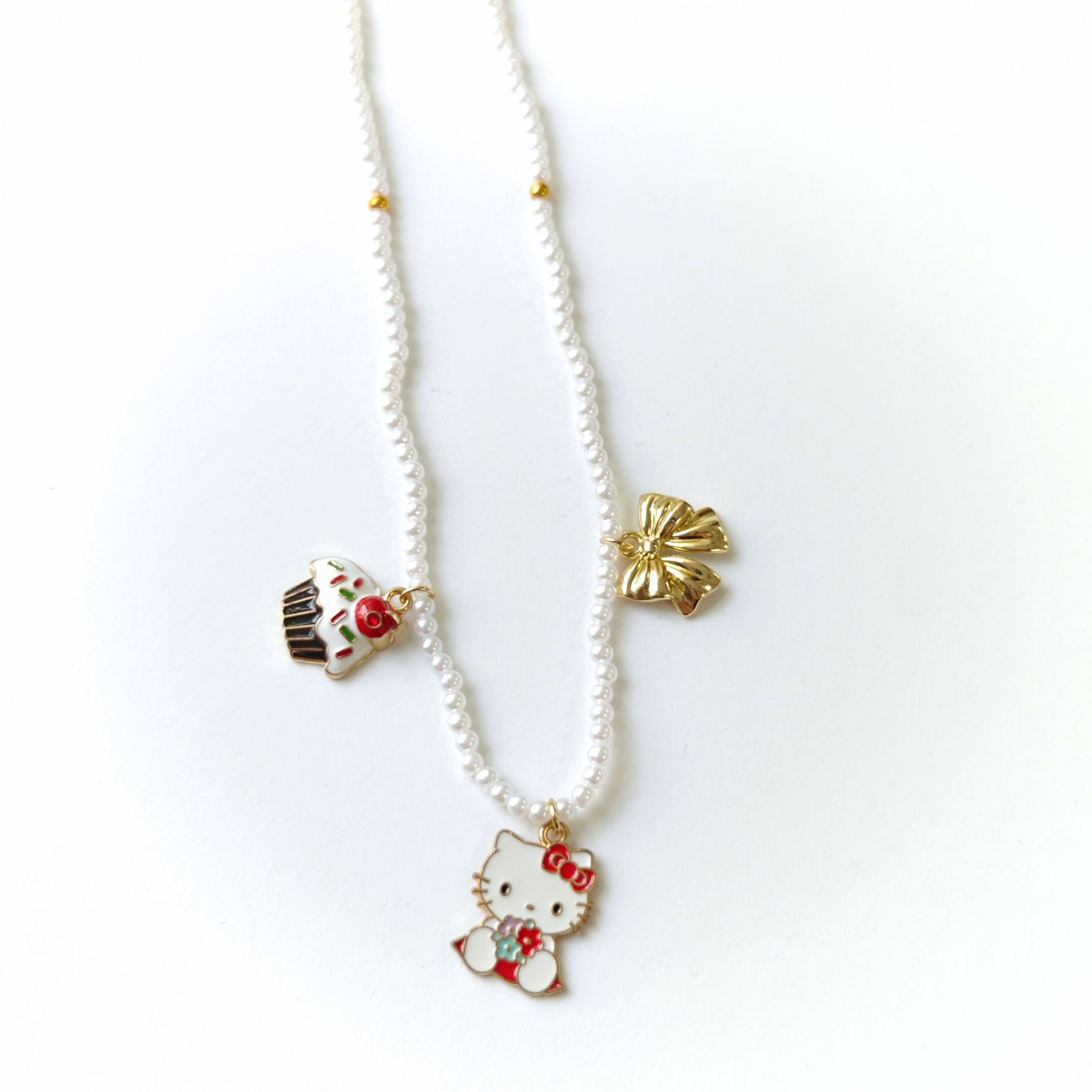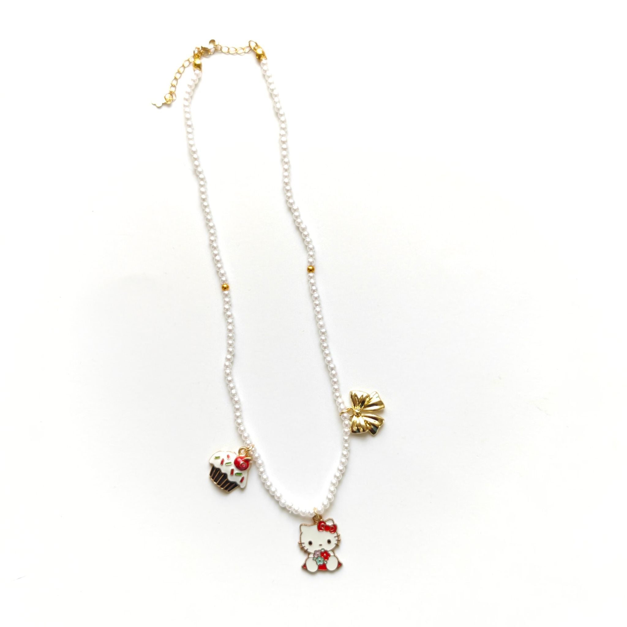 Sweet, sparkly, and oh-so-adorable! The Hello Kitty Charm Necklace features delicate white pearl beads with gold accents and three playful charms — a cupcake, a golden bow, and our favourite kitty dressed for fun. It’s the perfect mix of cuteness and charm, handmade to brighten every outfit from playdates to parties.