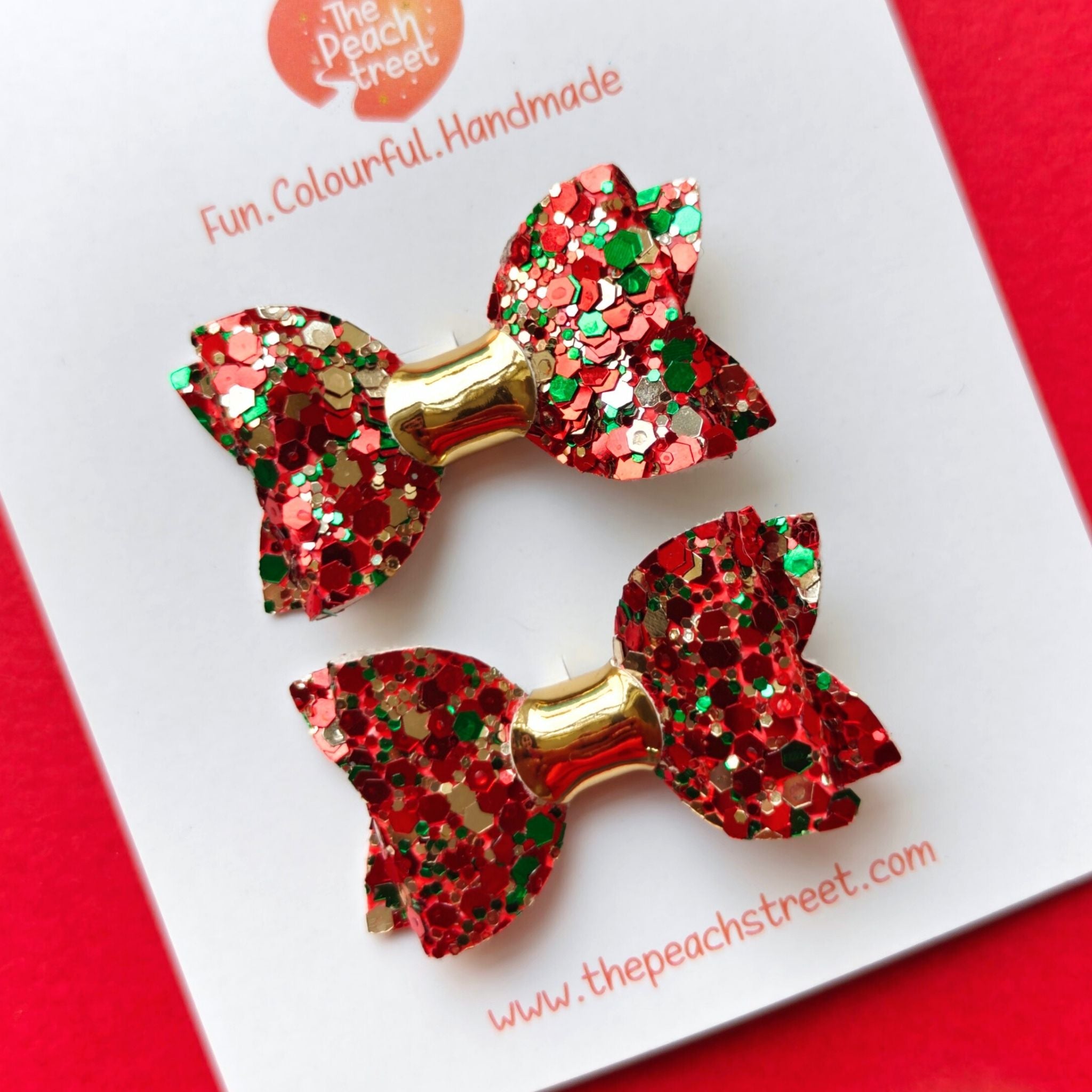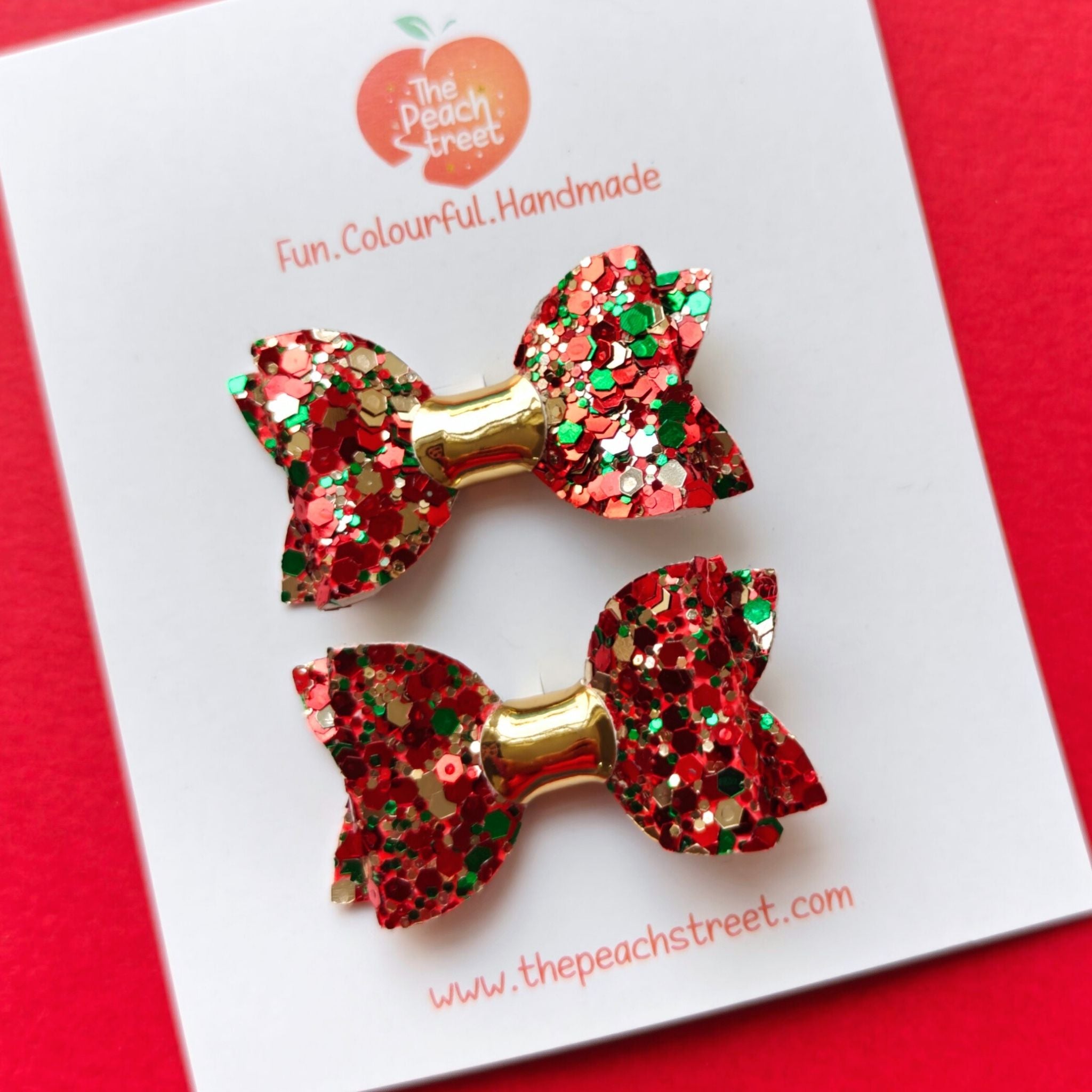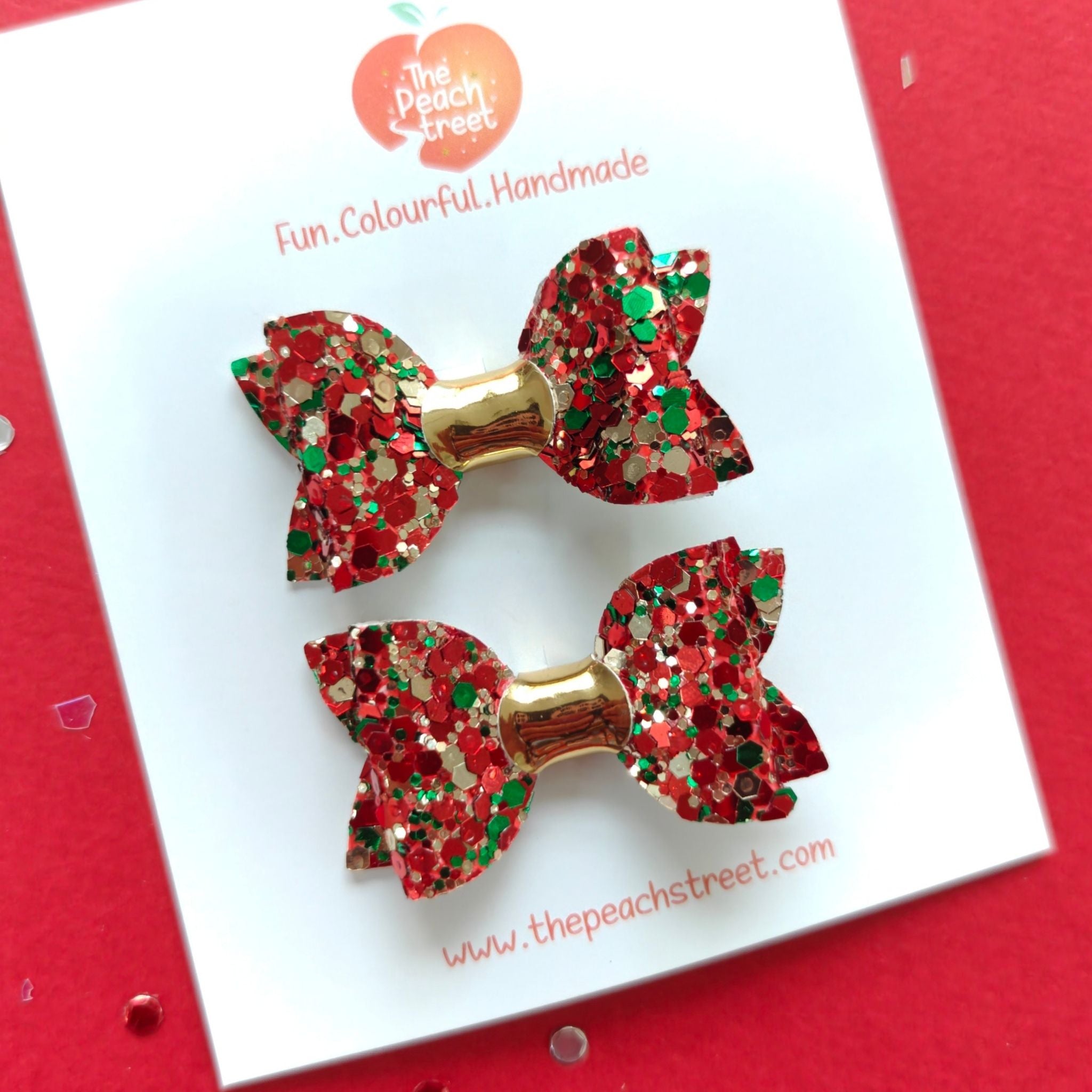Tiny, twinkling, and oh-so-festive β our Holly Sparkle Pigtail Bows bring the magic of Christmas to every hairstyle! Crafted with shimmering red, green, and gold glitter and finished with a glossy gold center, these bows are the perfect holiday sparkle for your little oneβs pigtails. Whether itβs for Christmas parties or everyday festive cheer, they shine bright with Fun, Colourful, Handmade joy!