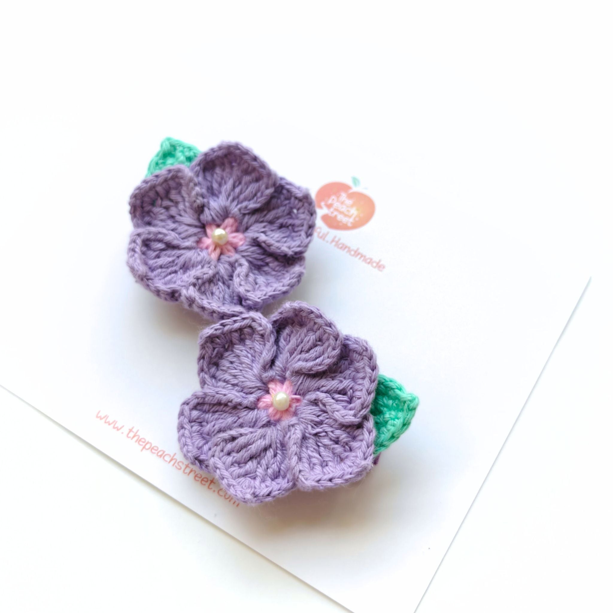 A delicate touch of floral charm! 🌸✨ The Lavender Bloom Hair Clips are a dreamy addition to any hairstyle, featuring intricately hand-crocheted pink flowers with a soft pearl centre and dainty green leaves. Designed for comfort and durability, these hair ties hold your little one's hair in place while adding a whimsical, nature-inspired look. Whether for a special occasion or an everyday floral touch, these handcrafted beauties bring timeless elegance to every hairstyle. Handmade with love, just for you! 💕🌿