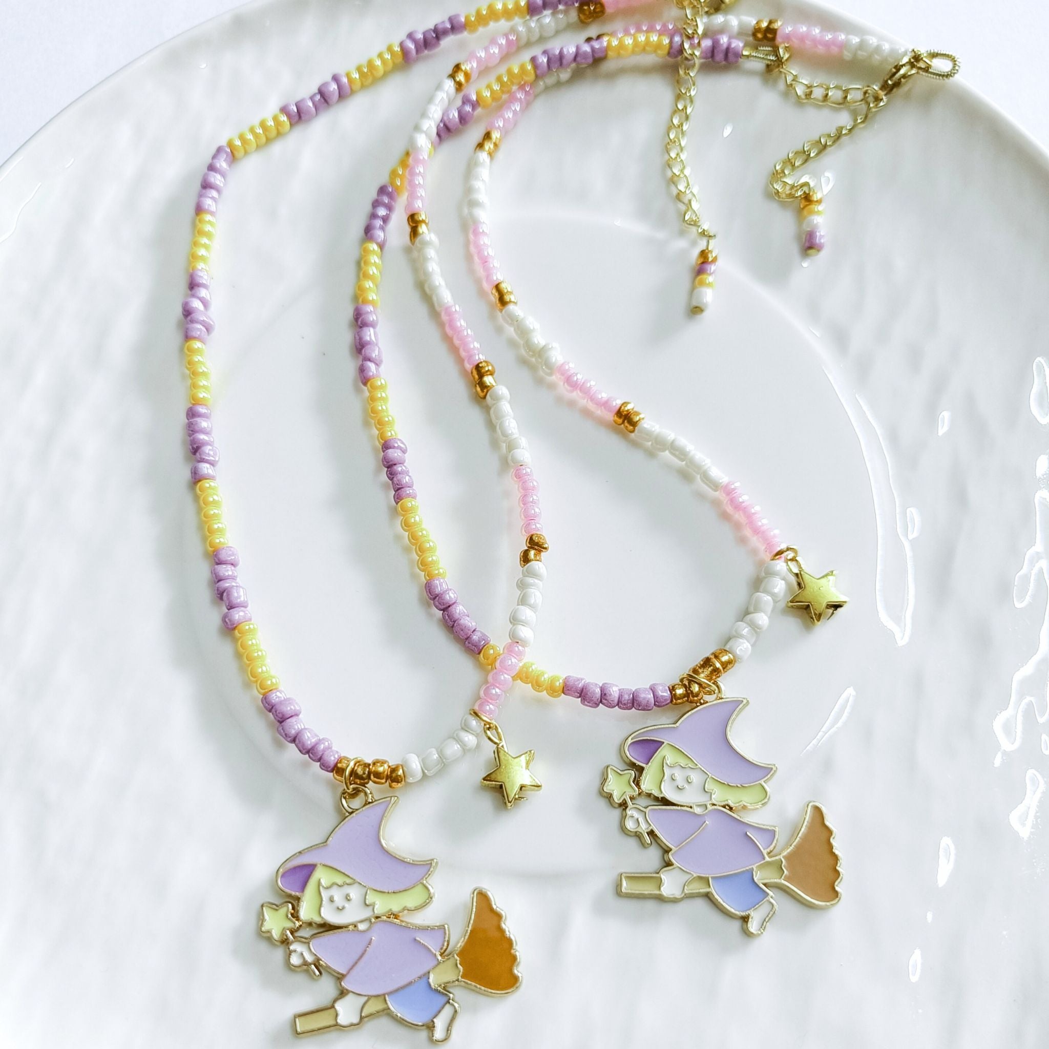 Our Adorable Lil' Witch Charm Necklace features a pastel-coloUred witch flying on her broomstick, this playful necklace is accented with delicate star charms and beaded with soft shades of purple, yellow, and pink. Perfect for adding a whimsical touch to any Halloween celebration, this necklace is lightweight and adjustable to fit comfortably around your child's neck. Whether it’s for a costume or just to embrace the spooky season, this charming accessory will cast a spell on everyone around!
