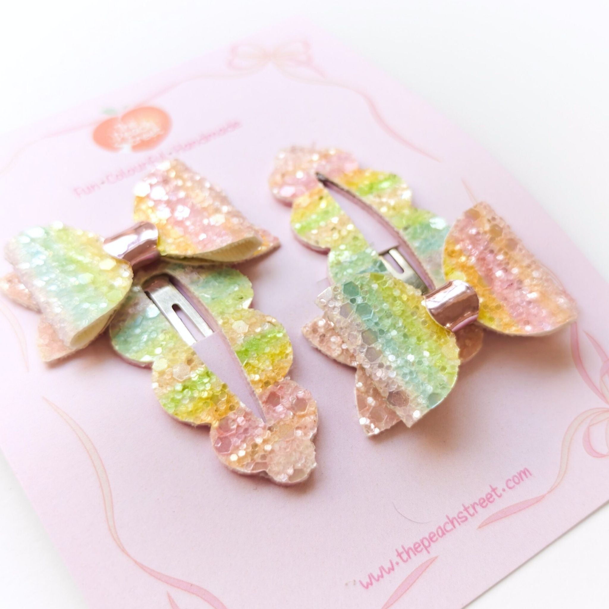 A sweet pair of bow clips in soft pastel hues with a gentle shimmer.