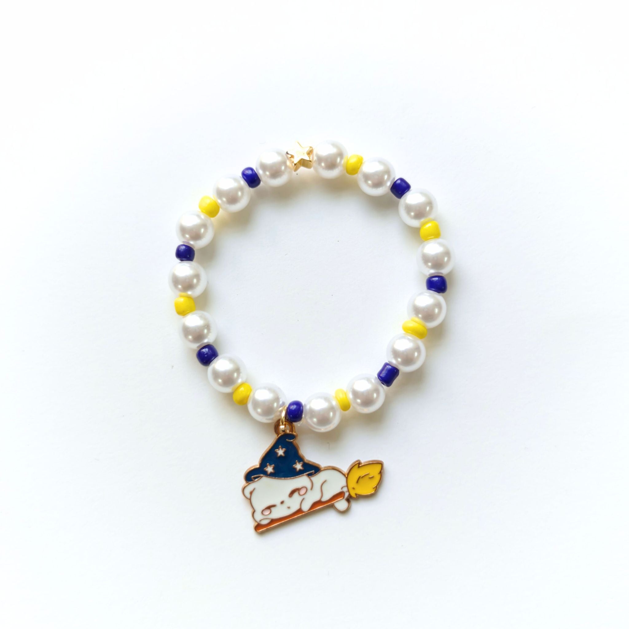 Fly into the Halloween night with our Midnight Flight Bracelet! Handcrafted with glossy pearls and pops of yellow and navy beads, it features a charming little ghost wearing a starry wizard hat, zooming away on a broom. Whimsical, magical, and perfectly spooky — it’s the sweetest way to add Halloween sparkle to your outfit!