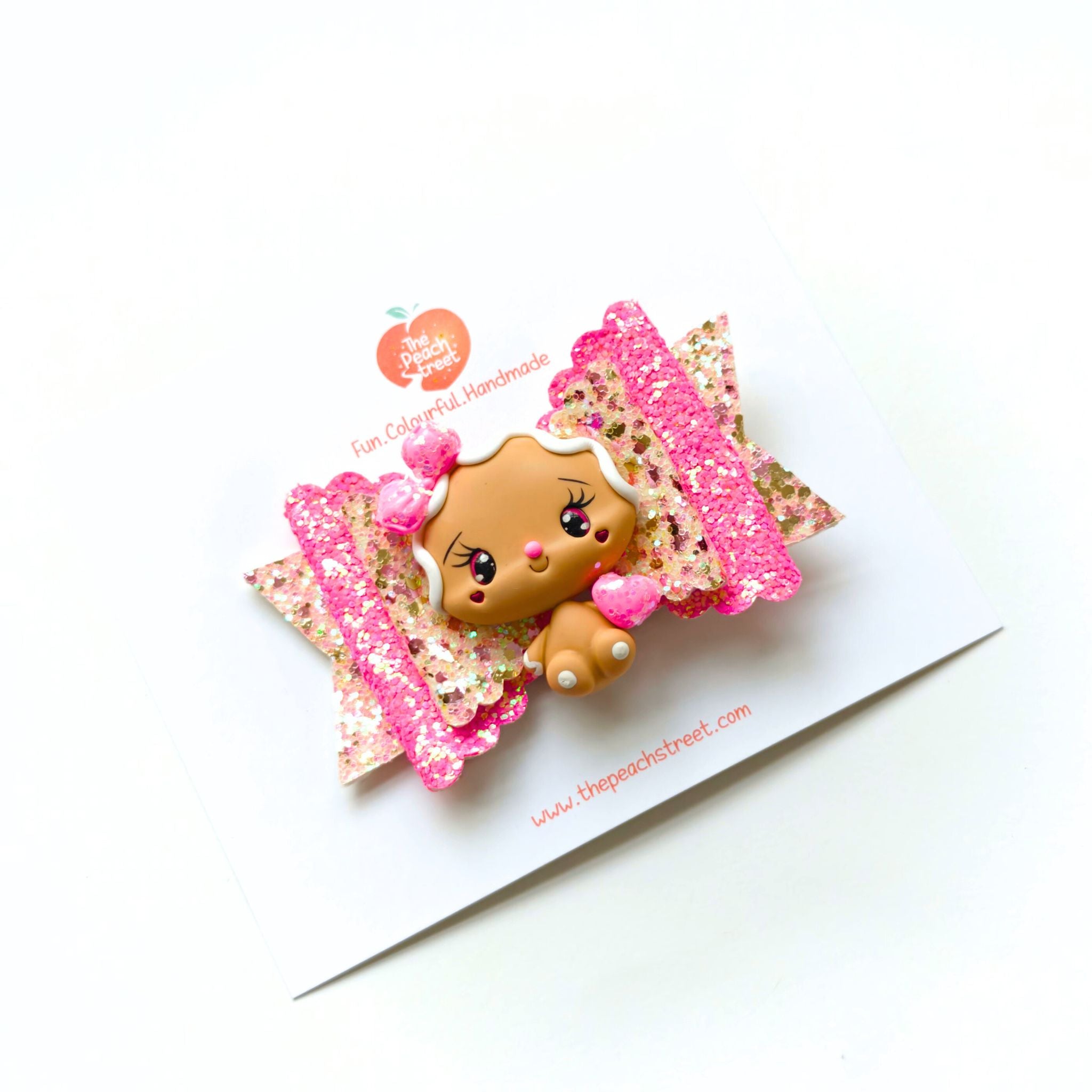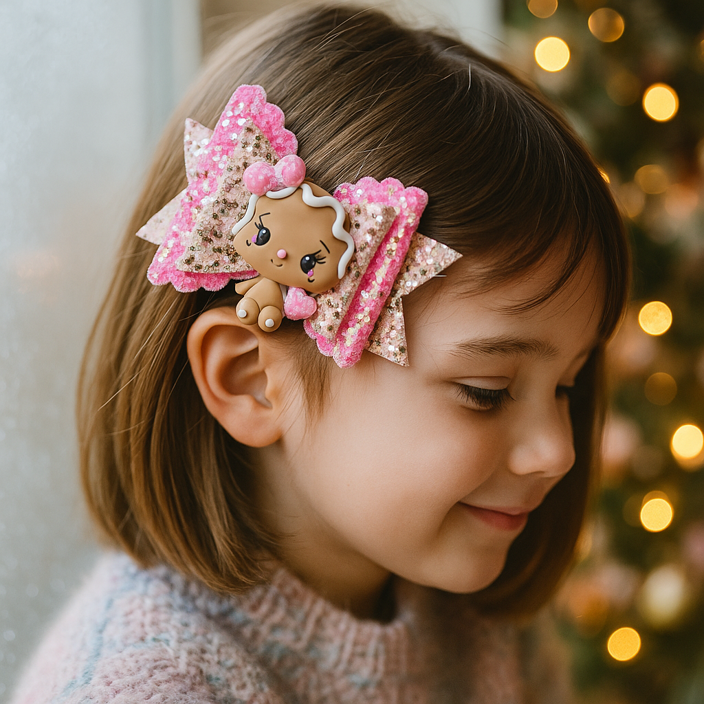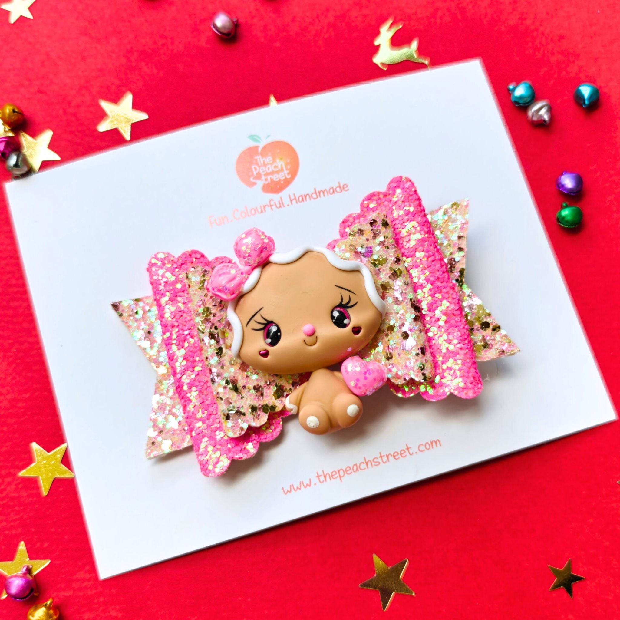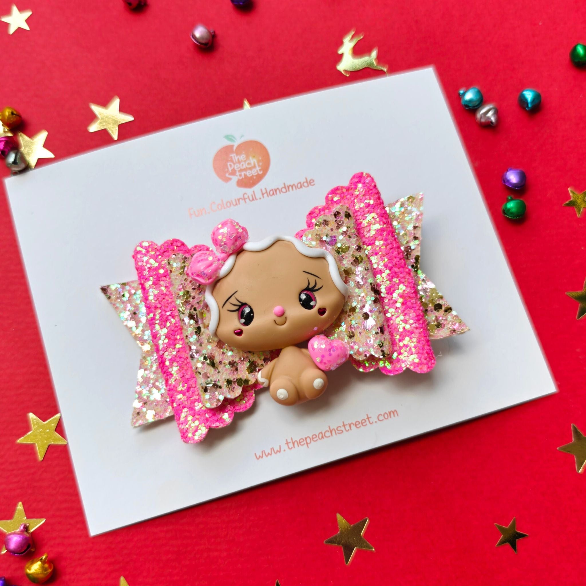 Meet Miss Ginger Sparkle — the sweetest little bow of the season! Handmade with layers of pink and gold glitter, she’s topped with an adorable gingerbread girl centerpiece complete with rosy cheeks and a matching bow. This festive favourite adds a dash of sugar, sparkle, and handmade love to every holiday outfit. Perfect for Christmas parties, cookie-baking days, and giggly gift exchanges.