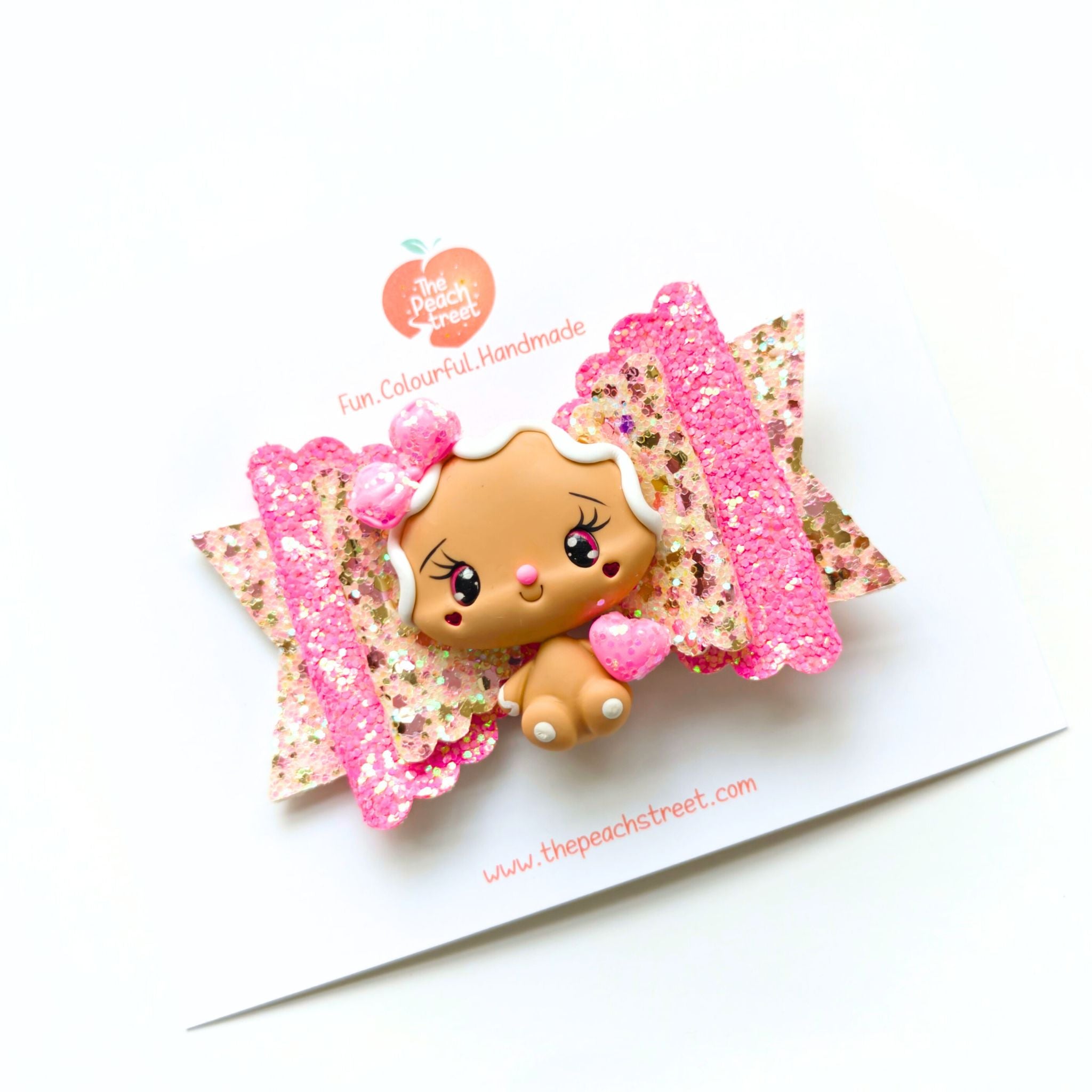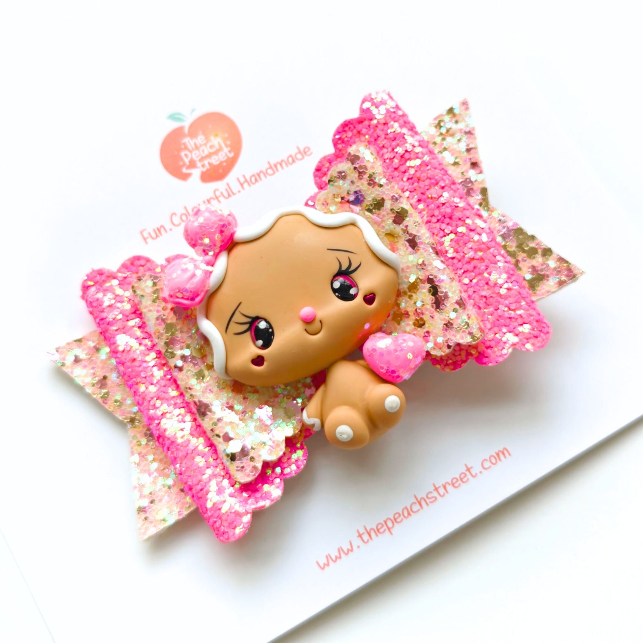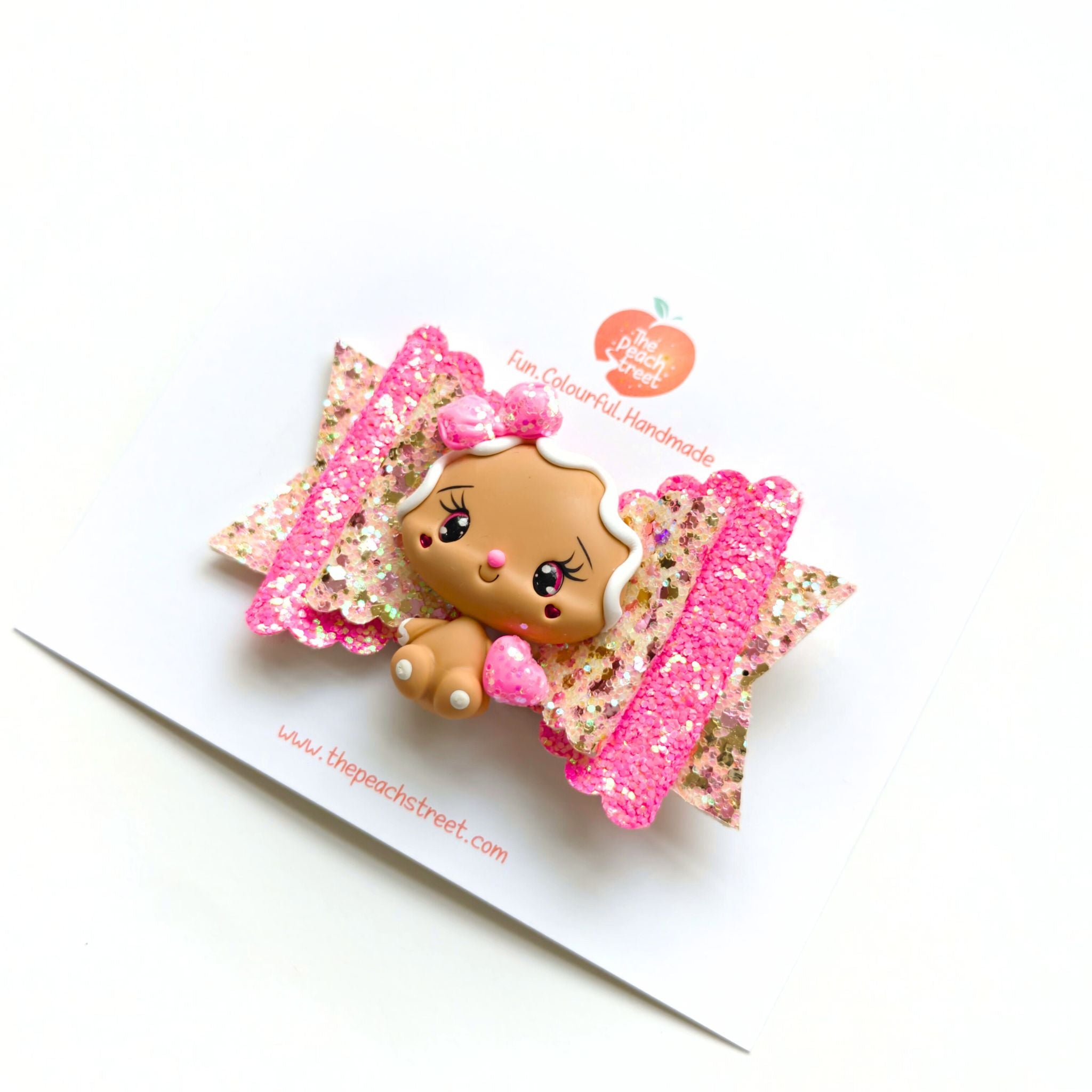 Meet Miss Ginger Sparkle — the sweetest little bow of the season! Handmade with layers of pink and gold glitter, she’s topped with an adorable gingerbread girl centerpiece complete with rosy cheeks and a matching bow. This festive favourite adds a dash of sugar, sparkle, and handmade love to every holiday outfit. Perfect for Christmas parties, cookie-baking days, and giggly gift exchanges.