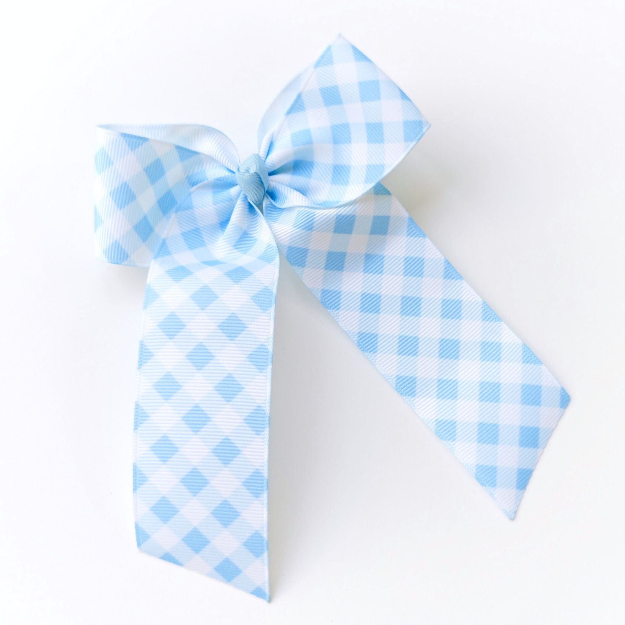 A timeless ribbon bow crafted in soft powder blue gingham, finished with elegant long tails for a vintage-inspired look. Light, airy, and endlessly charming, this bow adds a gentle pop of colour while keeping things classic and understated.