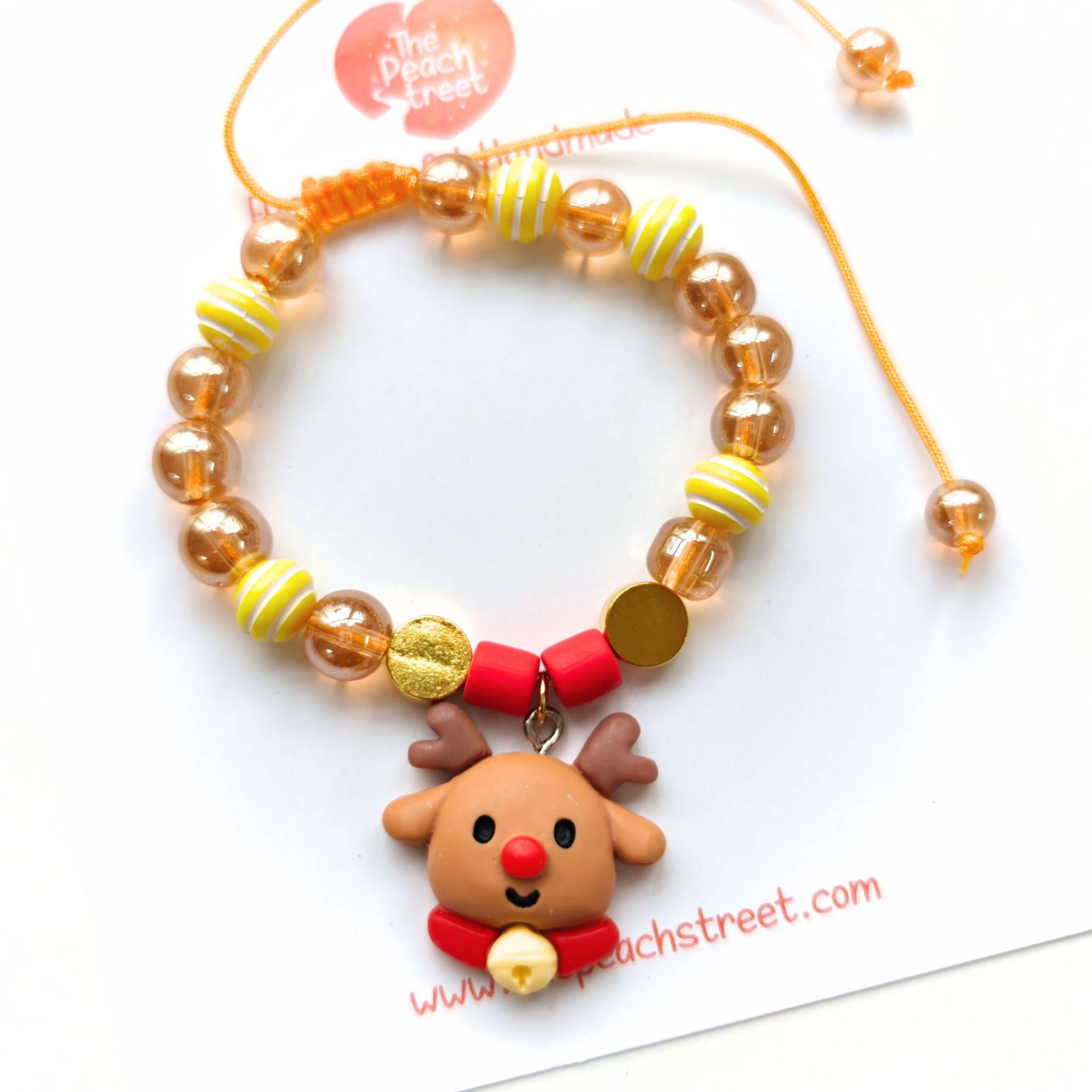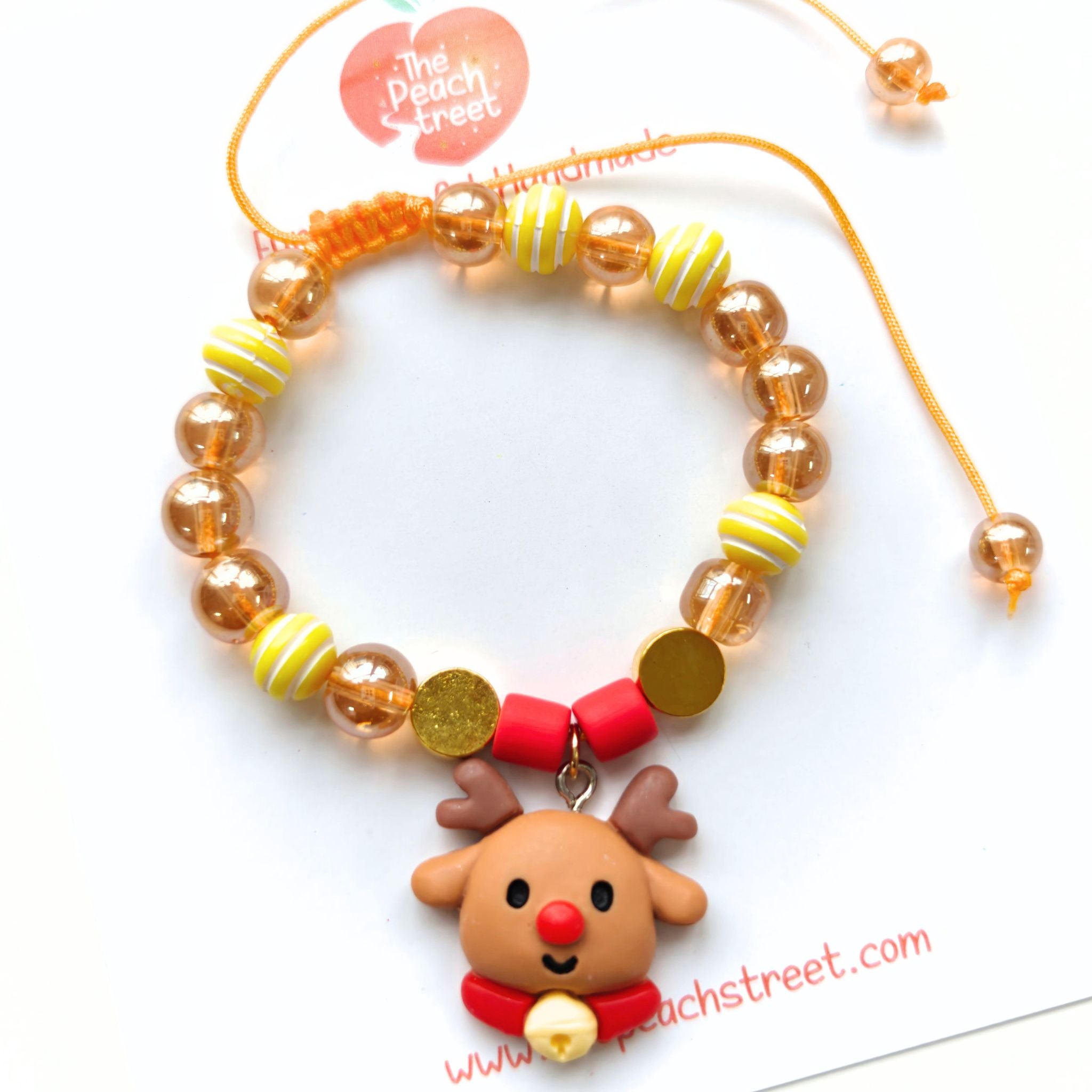 Say hello to Christmas cheer with our Rudy’s Jingle Bracelet! Featuring warm amber beads, cheerful yellow candy-stripe rounds, festive red accents, and shiny gold discs—it’s finished with the cutest round little reindeer charm complete with a red nose and tiny jingle bell. Adjustable, comfy, and handcrafted with love, this bracelet adds a playful dose of holiday magic to every outfit. 🦌✨🎄