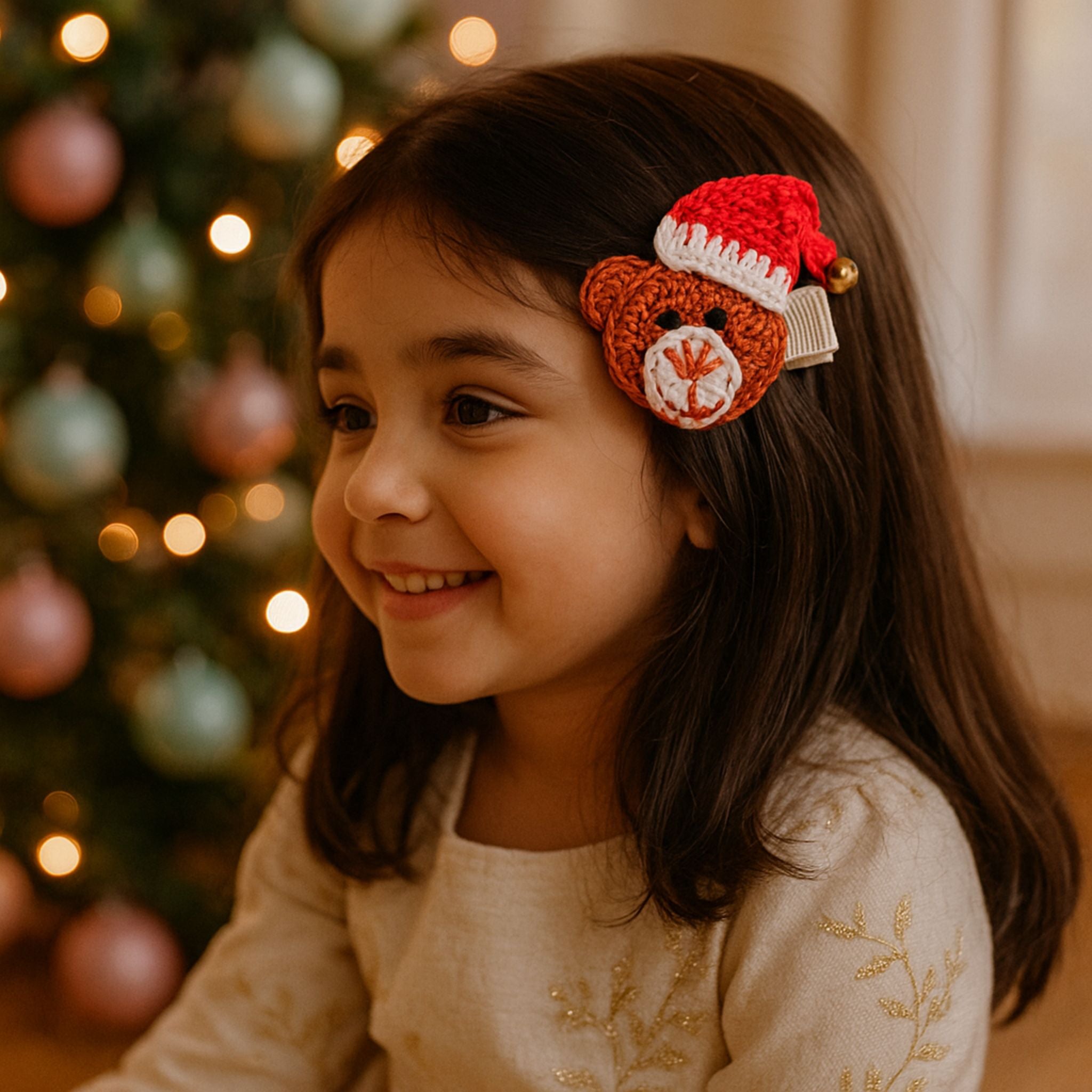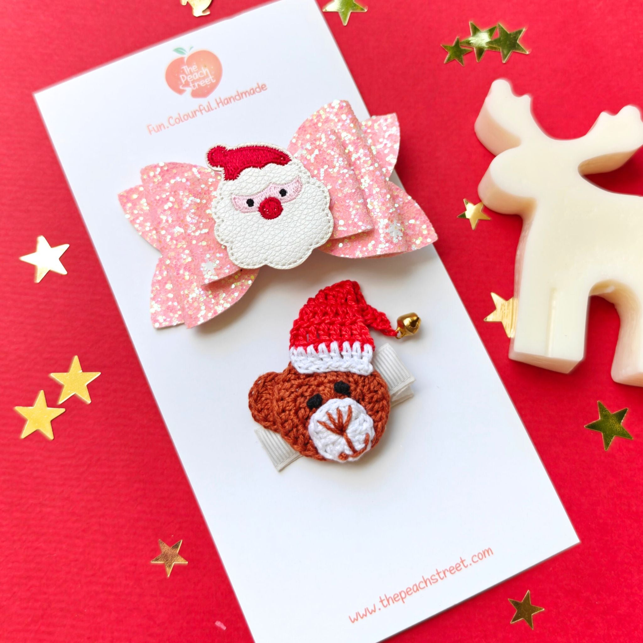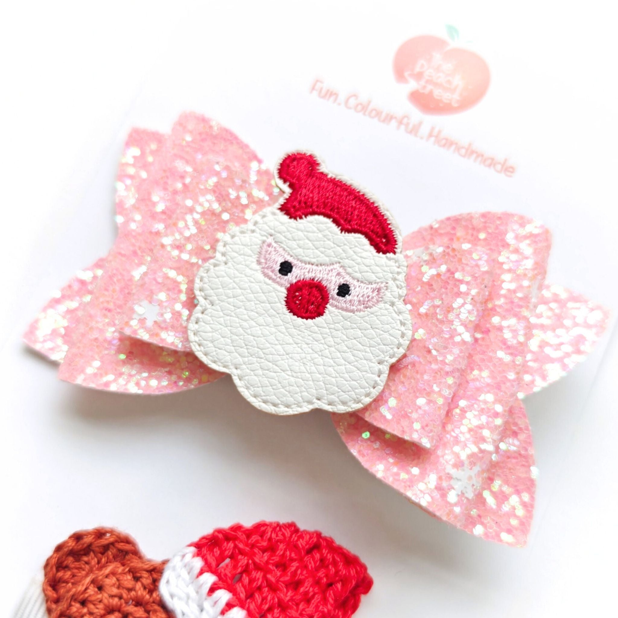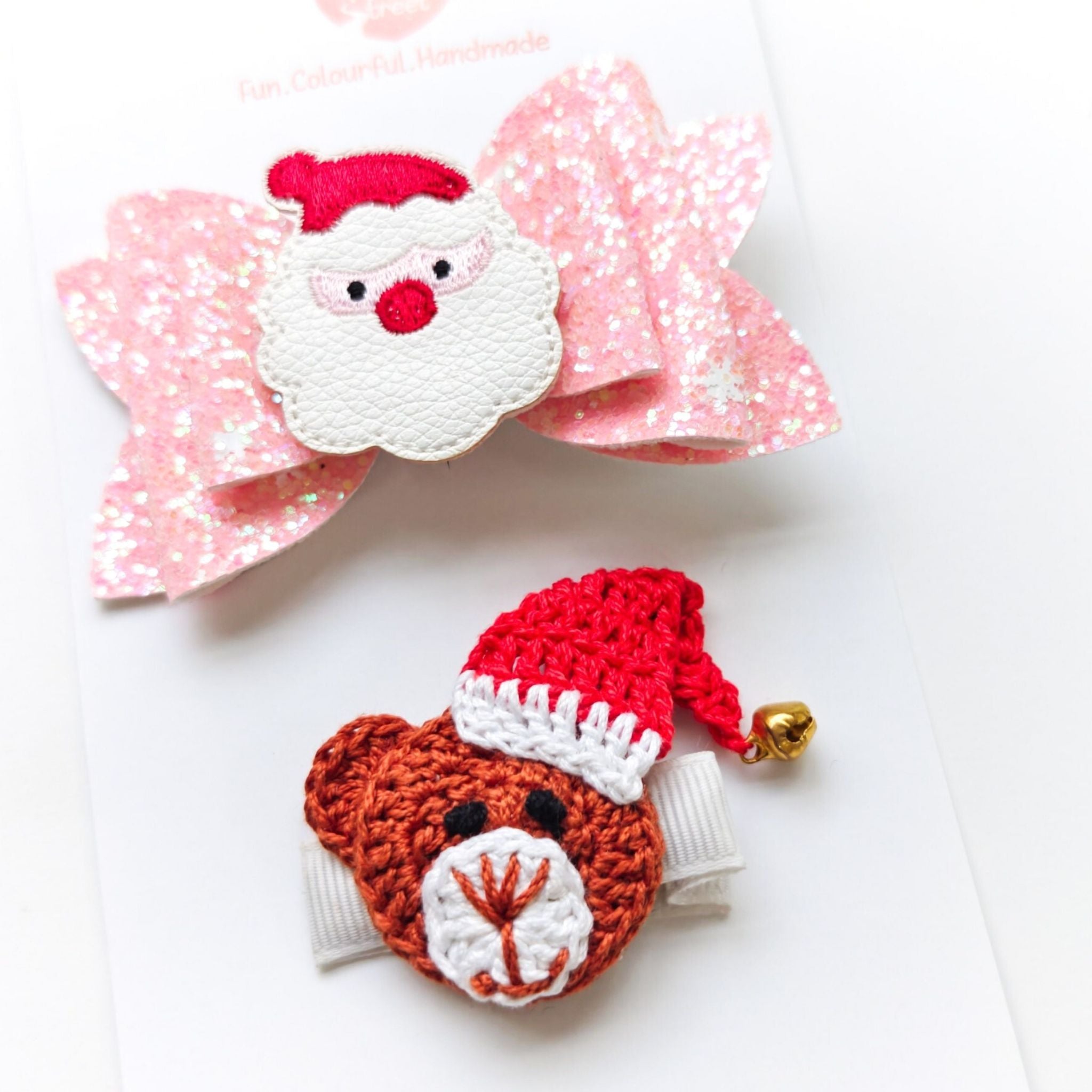 Meet the cutest Christmas combo β our Santa & Snuggle Set, featuring a glittery pink Santa bow and a hand-crocheted teddy clip wearing his tiny Santa hat and bell! π π§Έβ¨