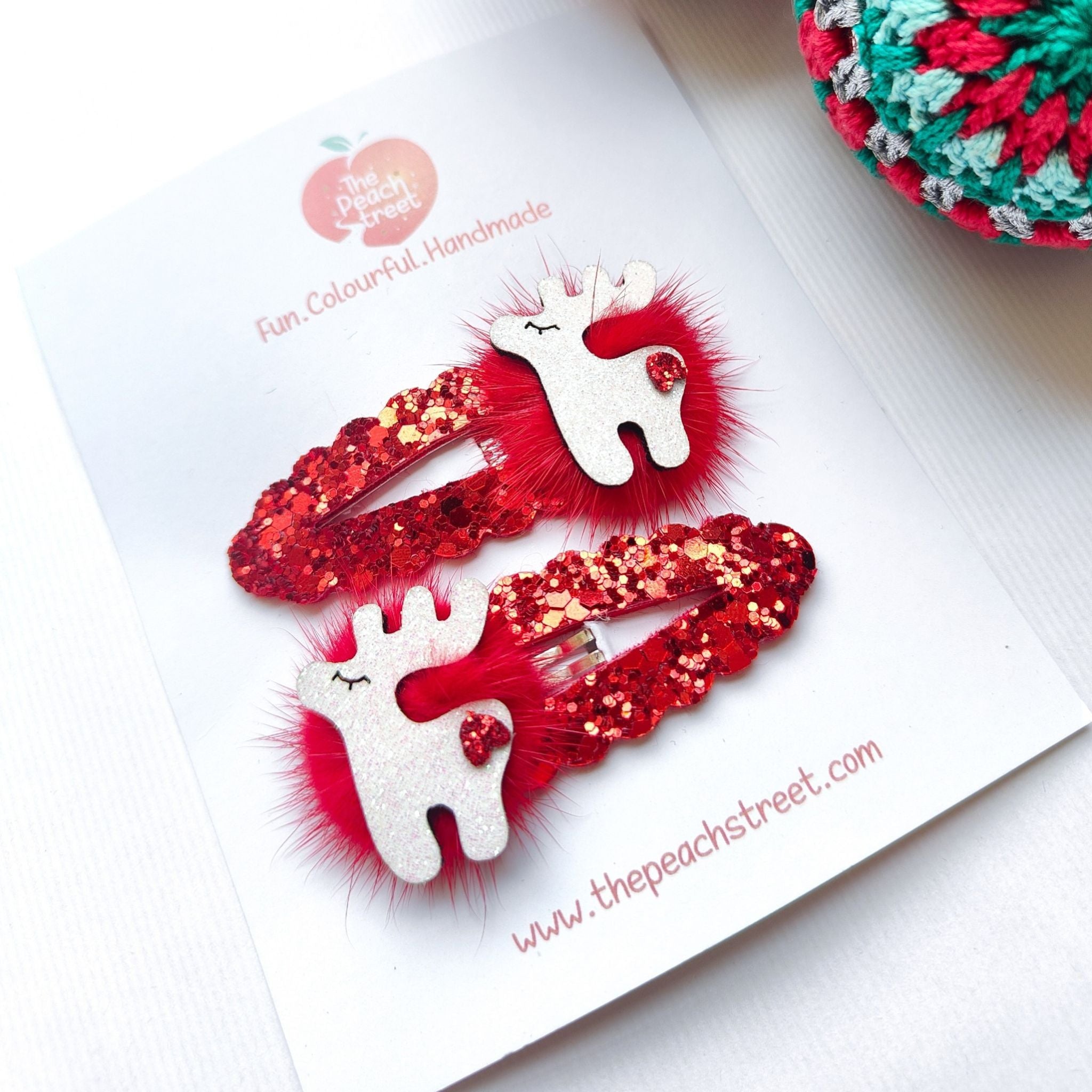 Bring festive charm to her hair with our Sparkling Reindeer Snap Clip Set! These dazzling red glitter clips feature adorable reindeer embellishments, complete with soft faux fur accents for a touch of wintery magic. Perfect for holiday parties, photoshoots, or simply adding some seasonal sparkle to her everyday style, these clips are both fun and festive. Let her celebrate the holiday season in style with these enchanting reindeer clips that capture the joy and warmth of Christmas!