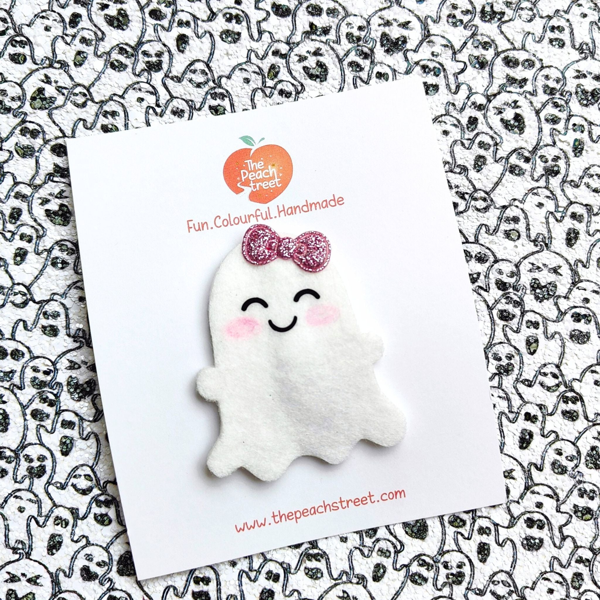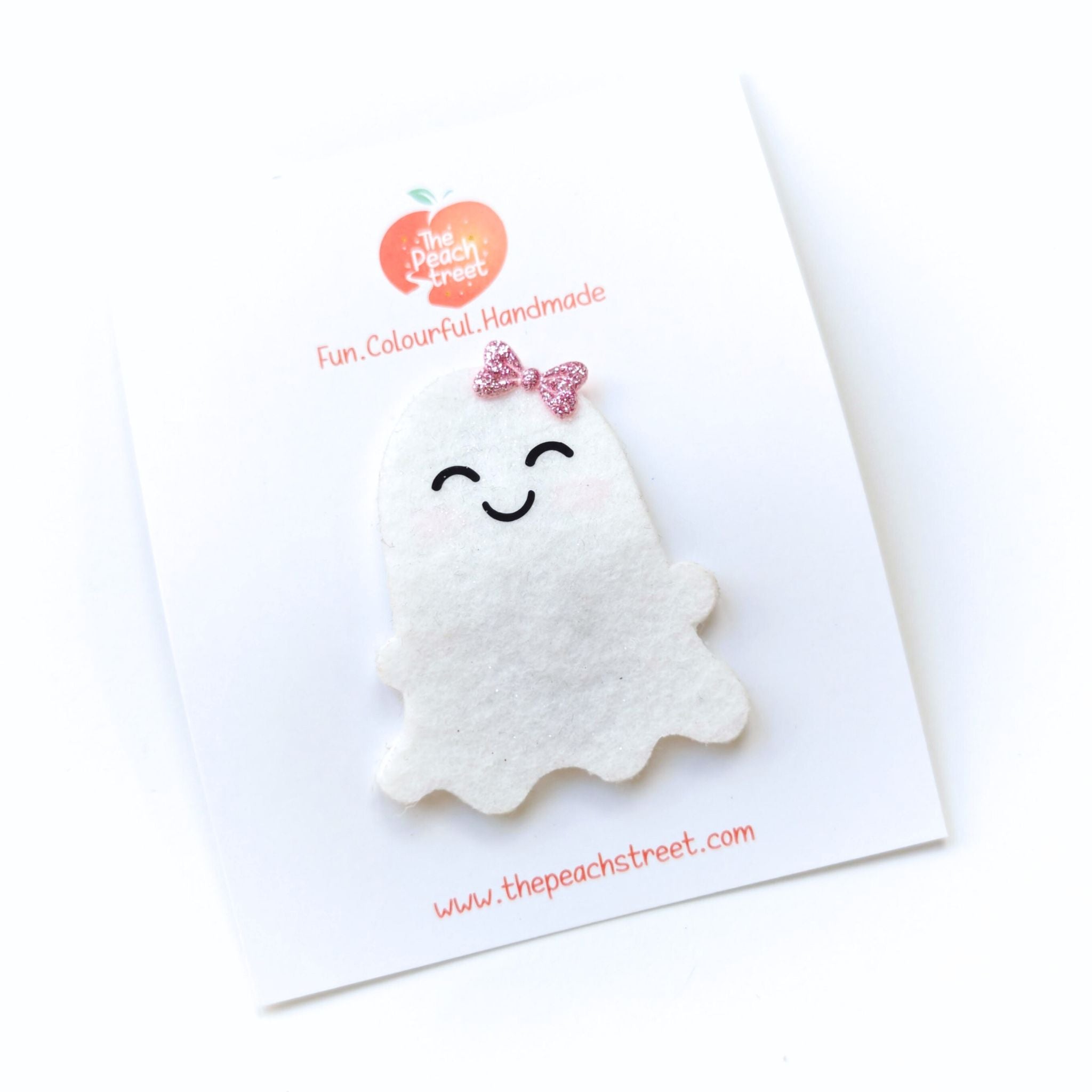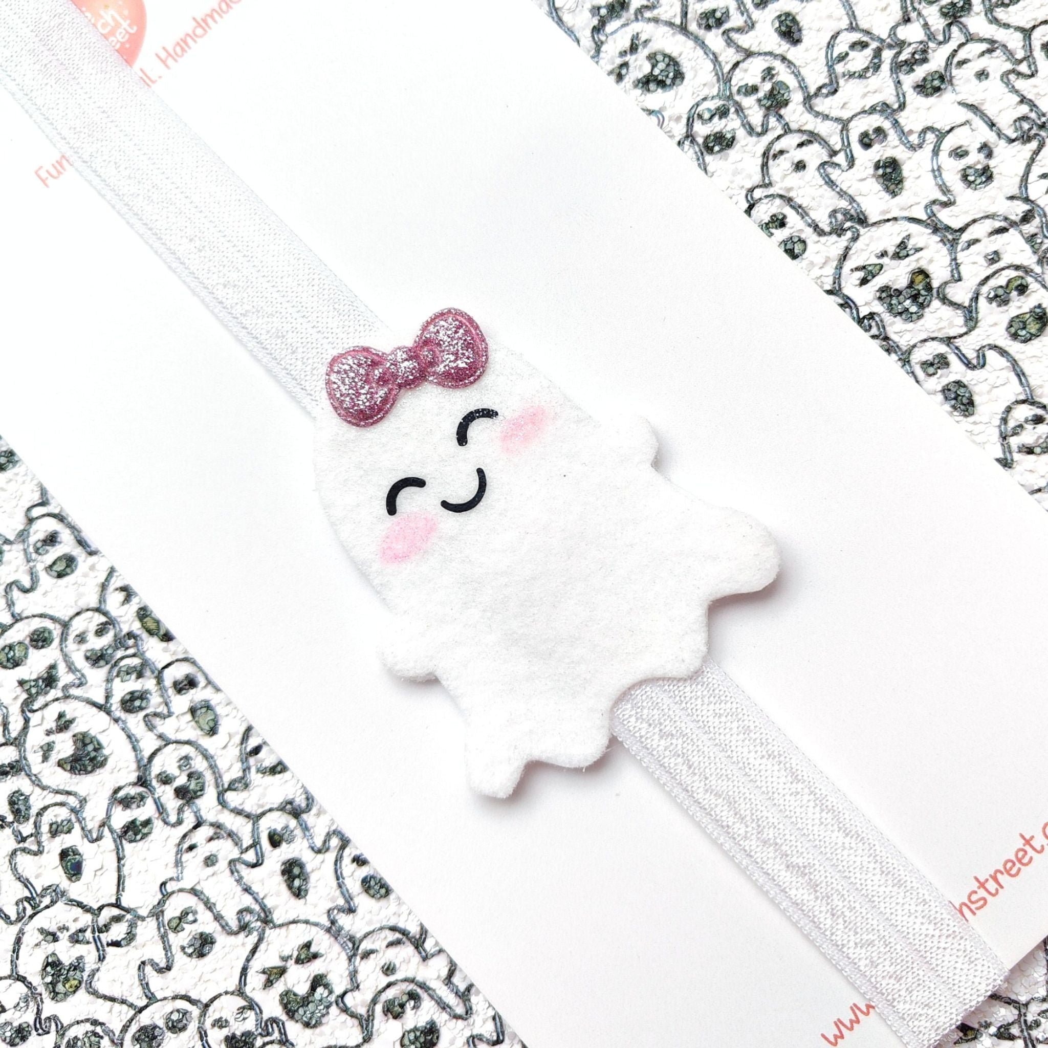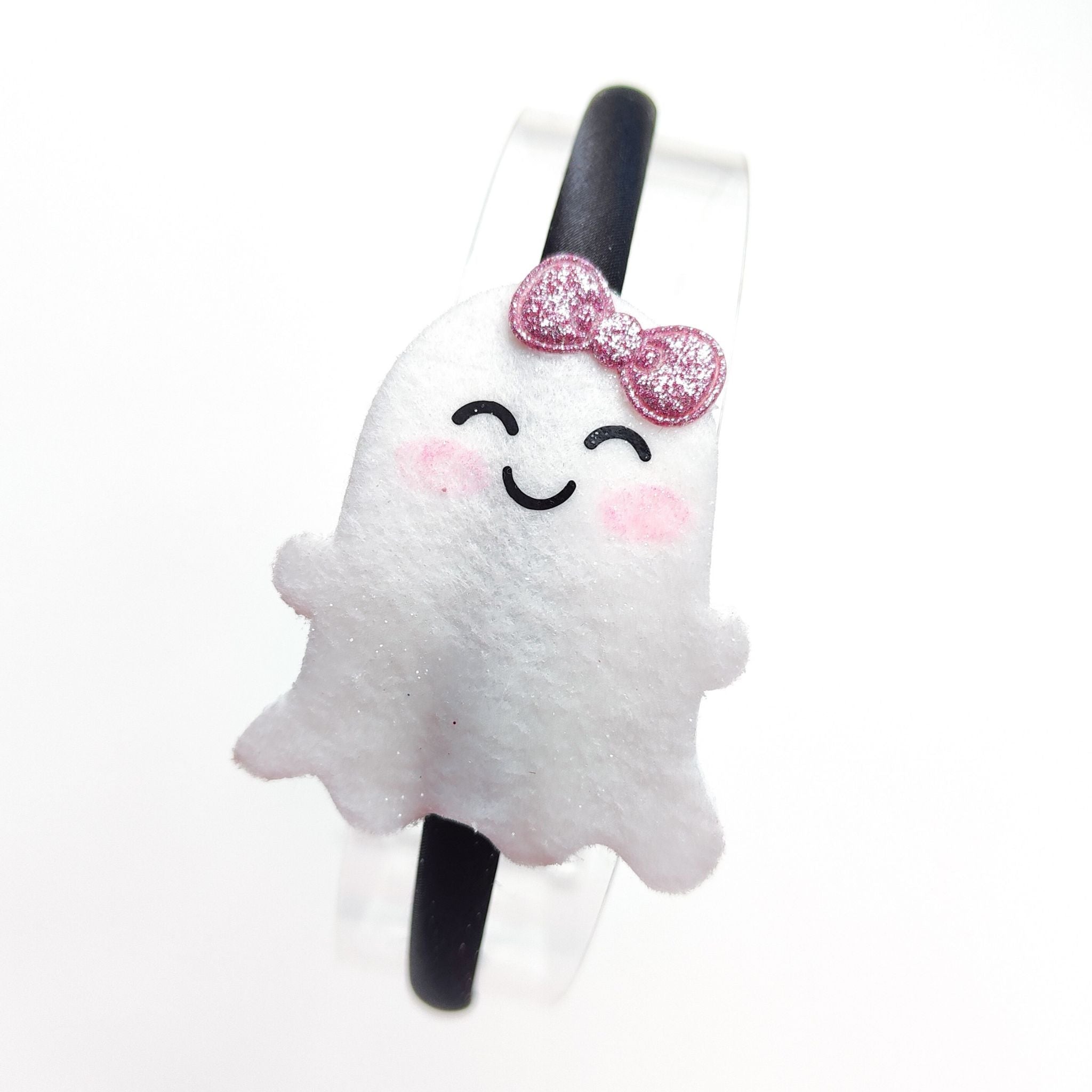 This charming ghost is made from soft white felt, featuring rosy cheeks, a joyful smile, and a glittery pink bow that adds a dash of sparkle. Perfect for Halloween festivities, this clip is available in multiple options, including a versatile snap clip, a comfortable headband, or a secure hairband. Whether dressing up for a Halloween party or adding a festive flair to everyday outfits, this cute ghost accessory is sure to delight.