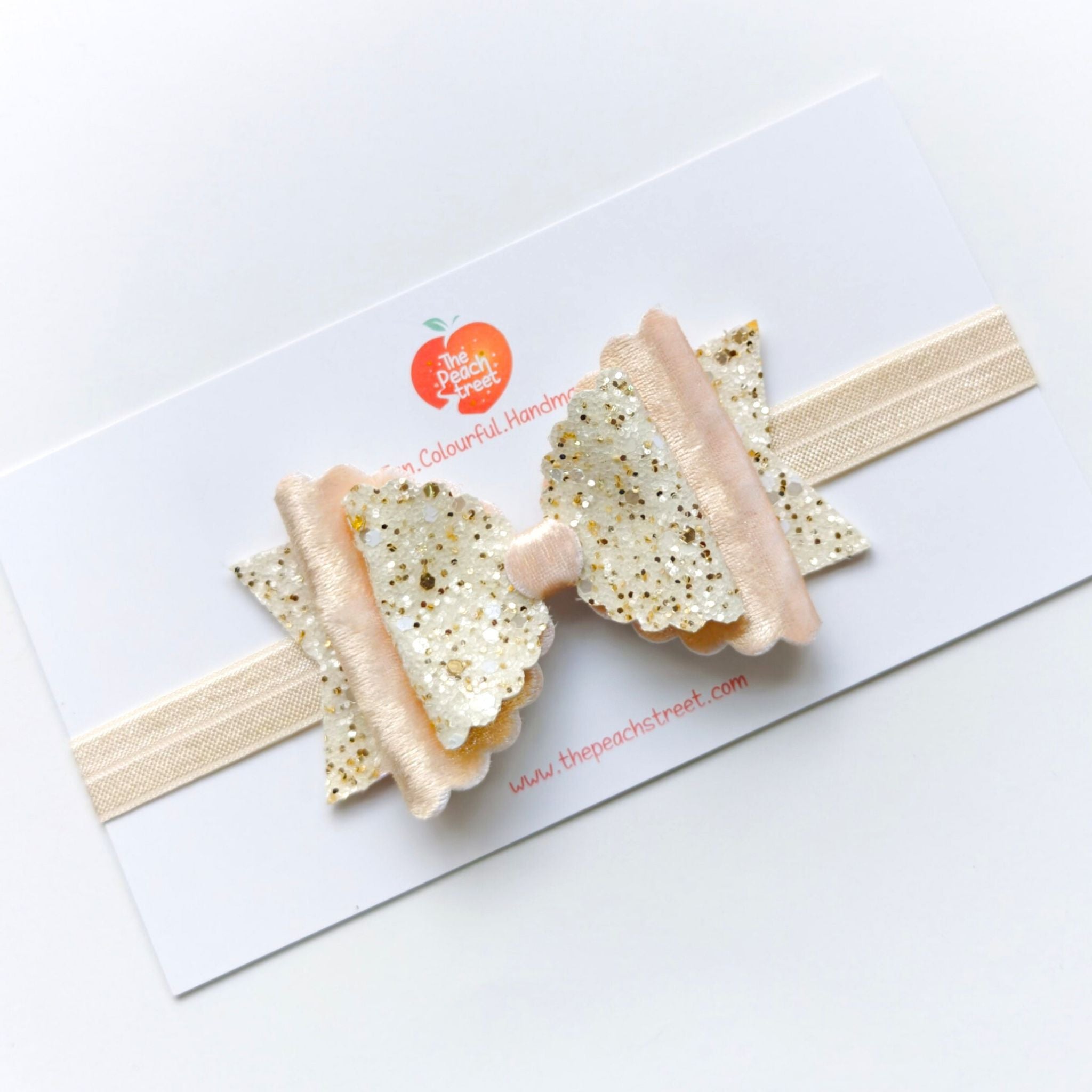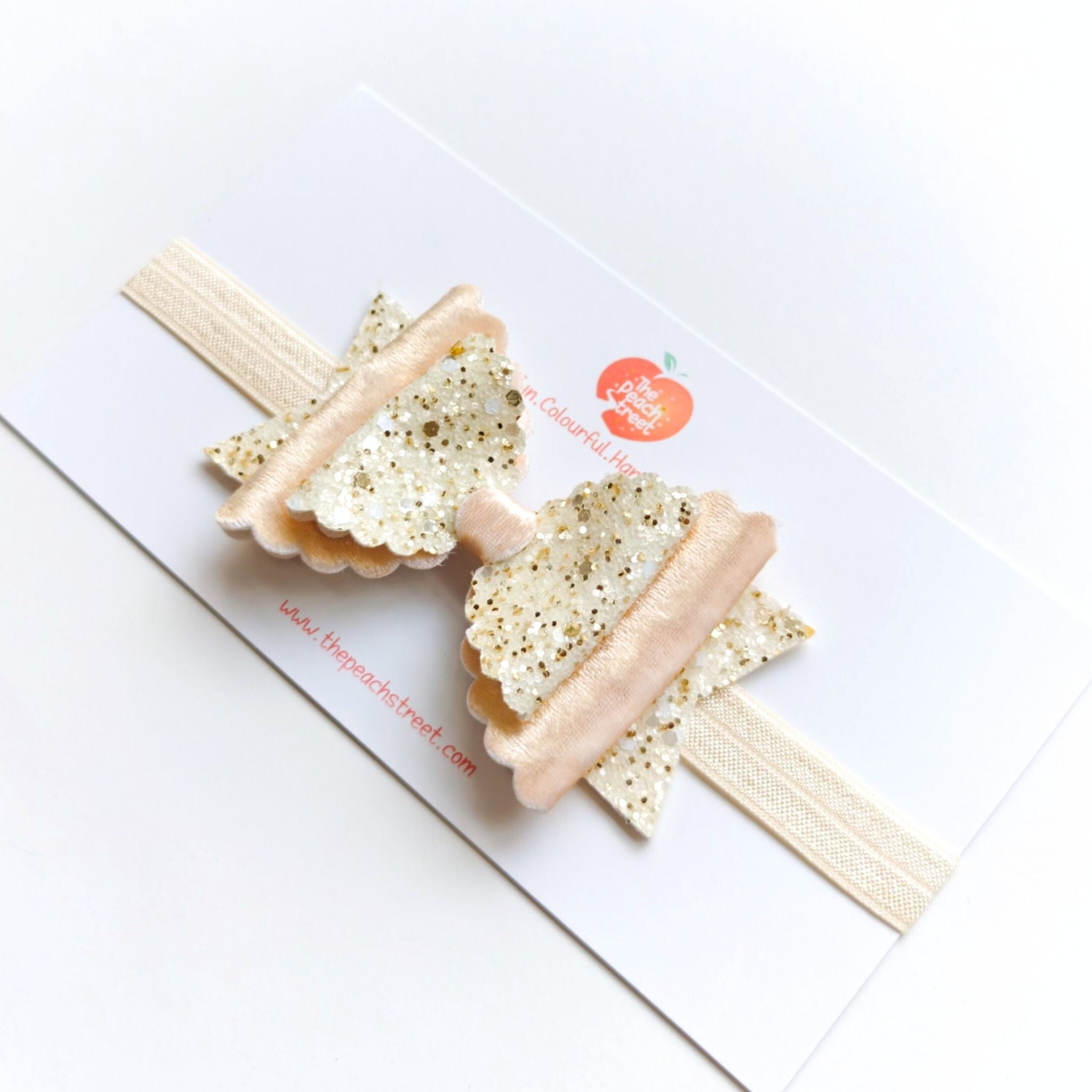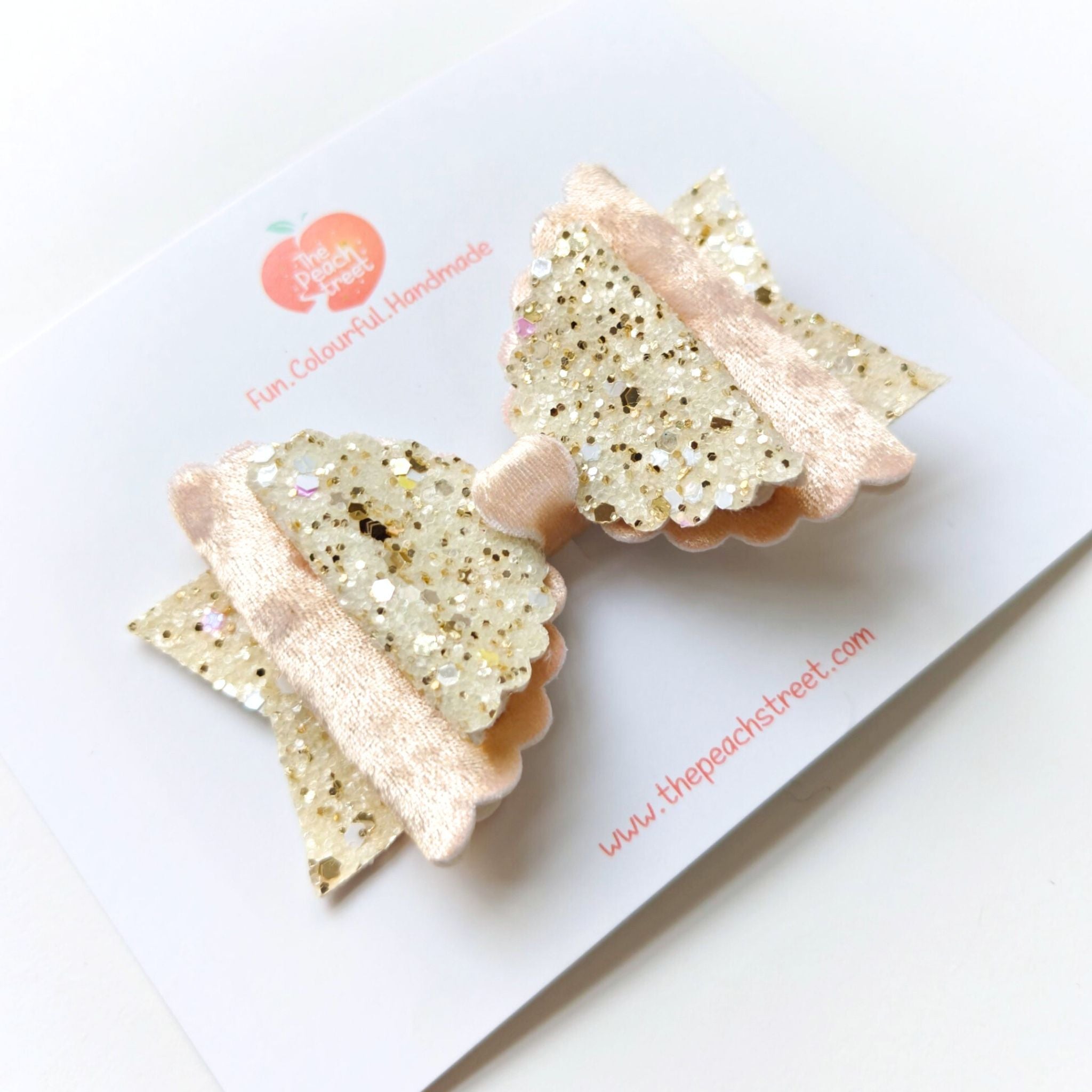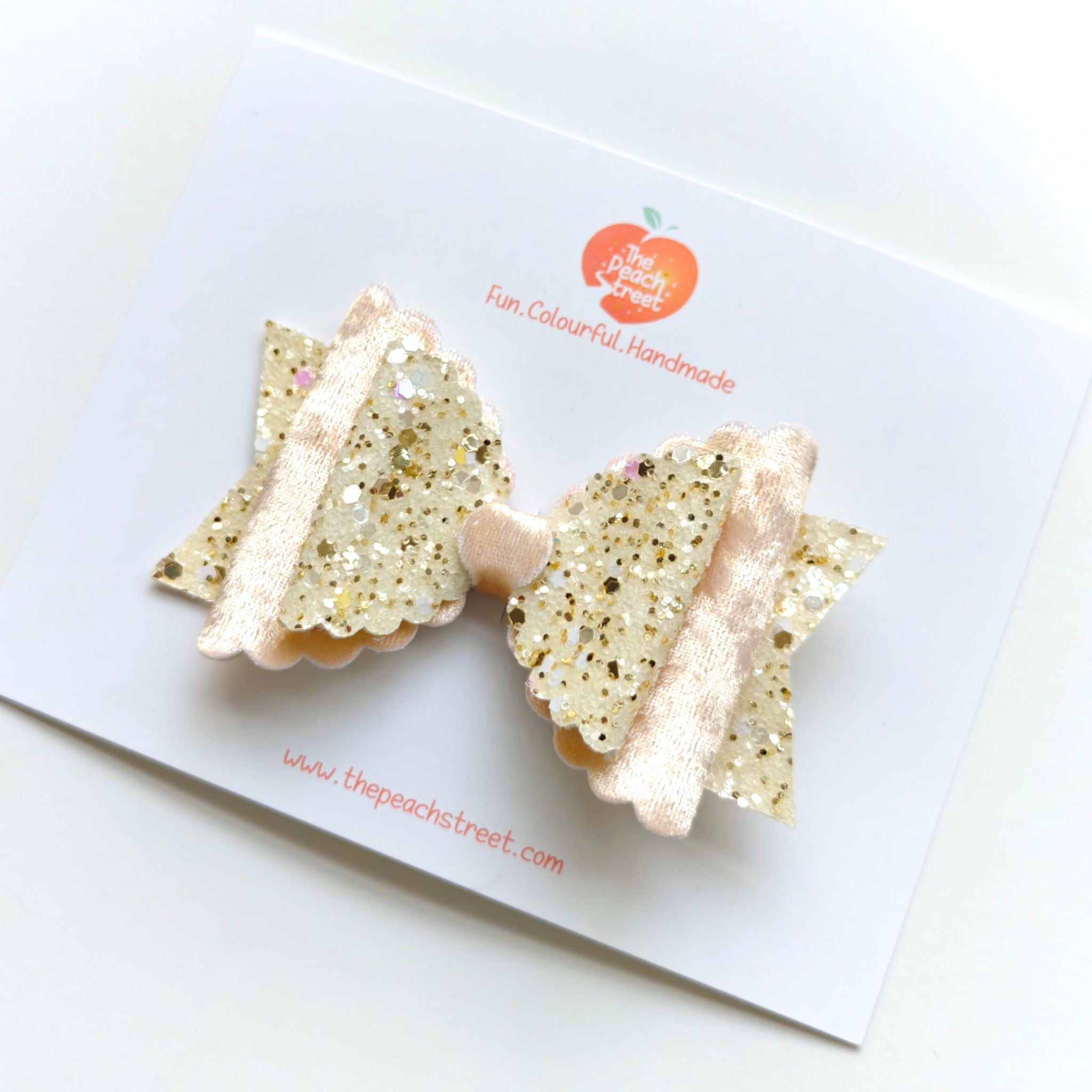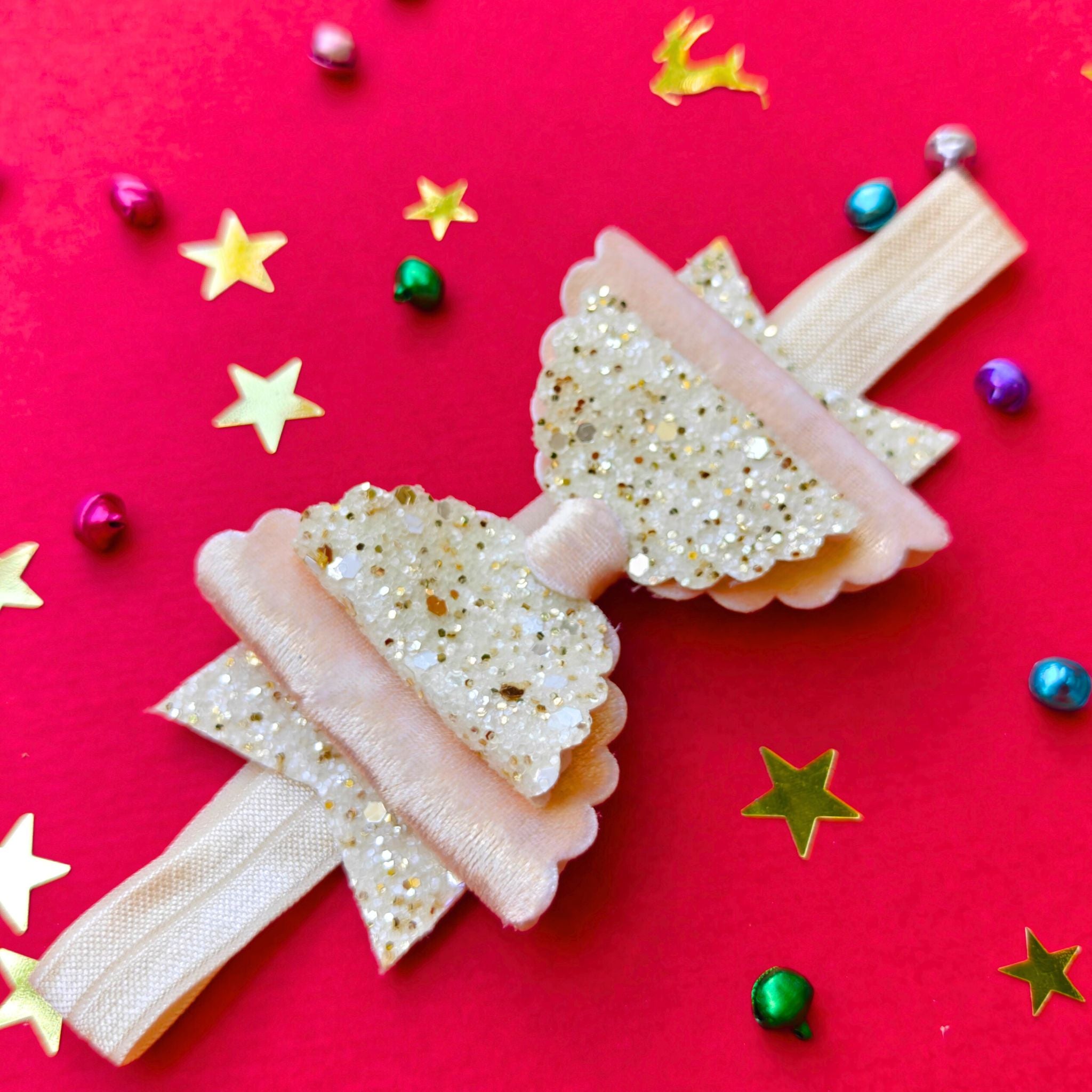 Handmade with layers of soft gold velvet and sparkling scalloped glitter, this bow adds a touch of timeless elegance to any holiday outfit. Perfect for Christmas mornings, twinkling New Year parties, and winter celebrations alike.